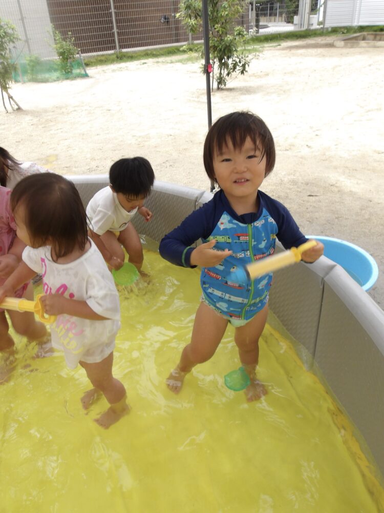 本日は雨が心配されていましたが…みんながプールに入る頃には雨が上がり、「プールできるね!」と嬉しそうにお話ししていましたよ😄