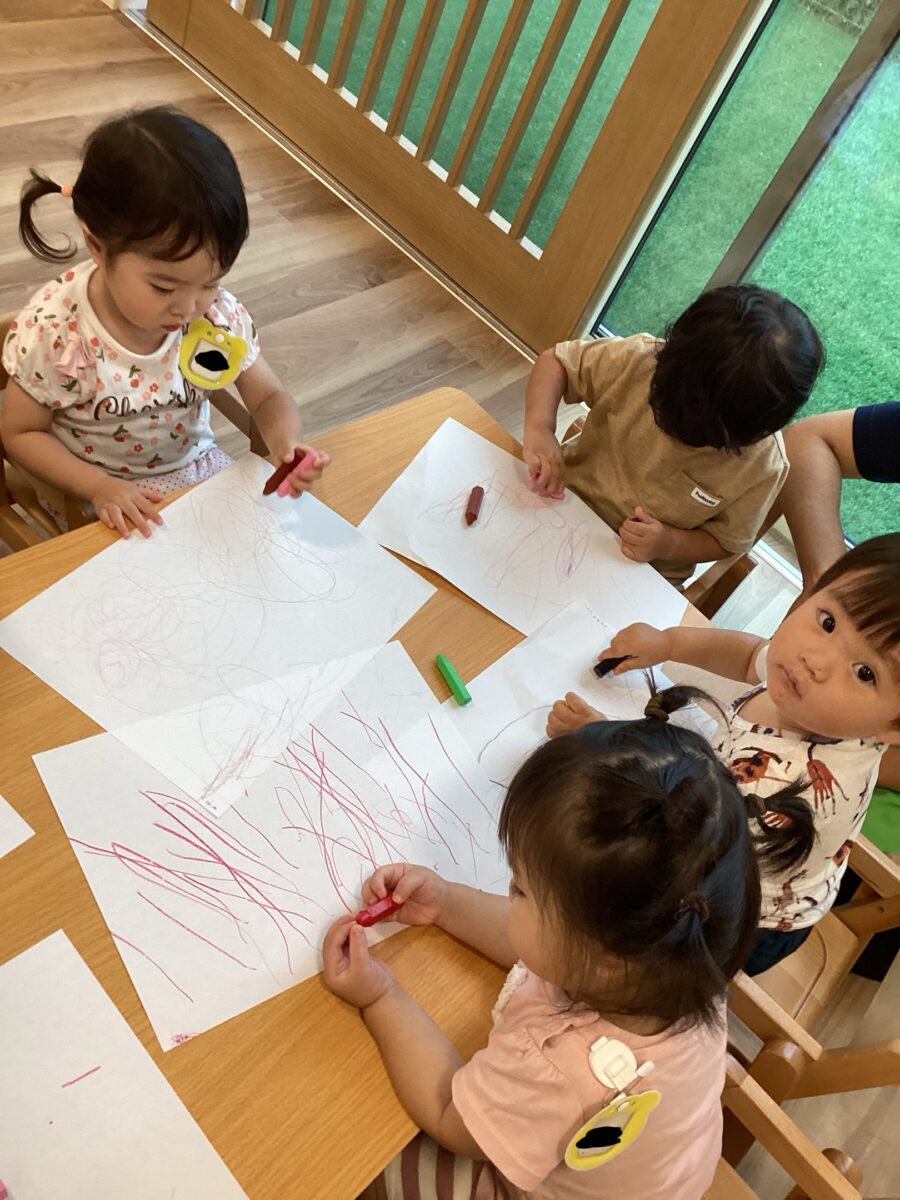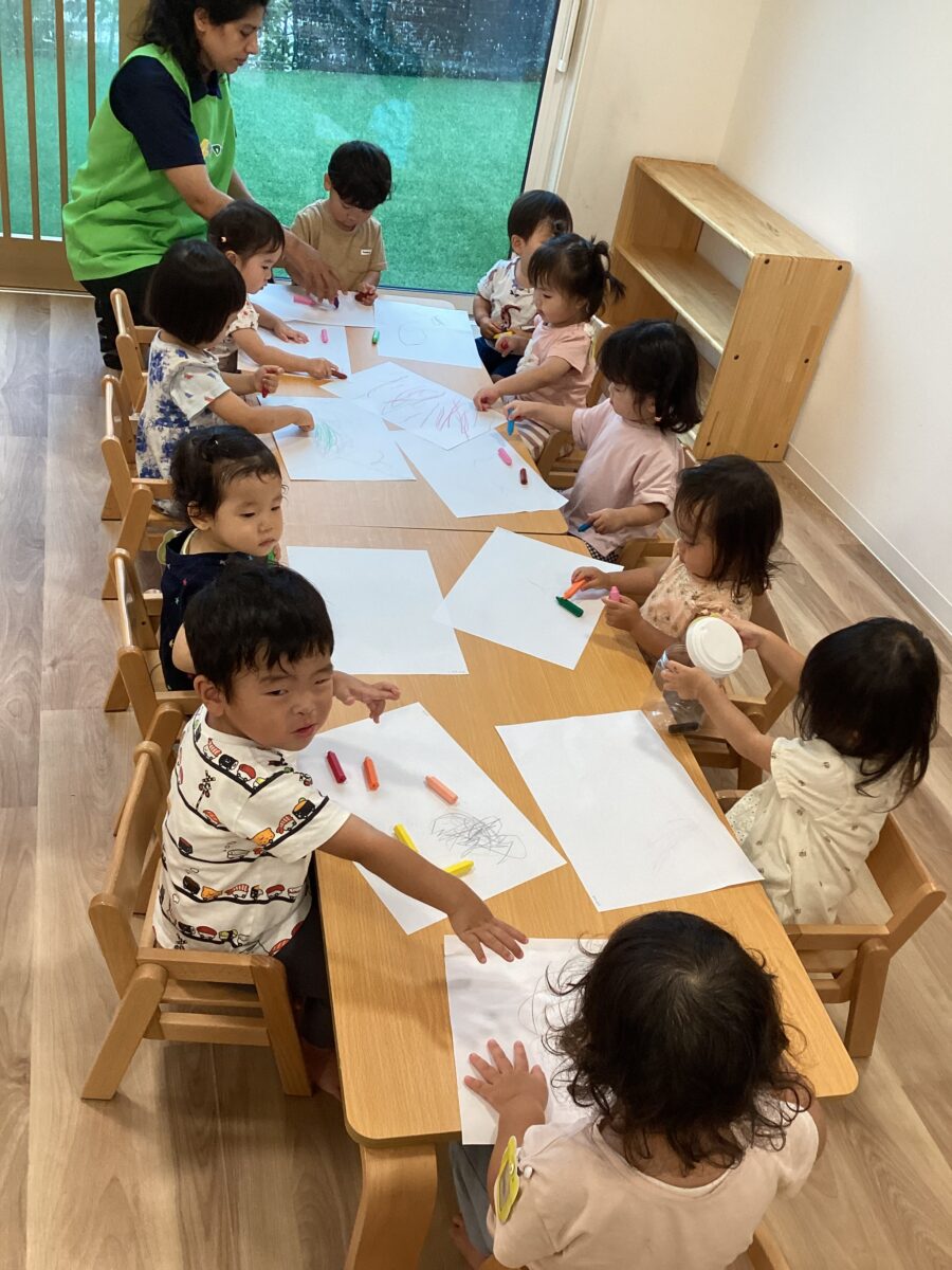 クレヨンを見せるとやりたいやりたい!と集まってきてくれた子どもたち。