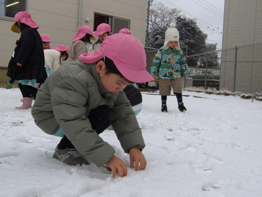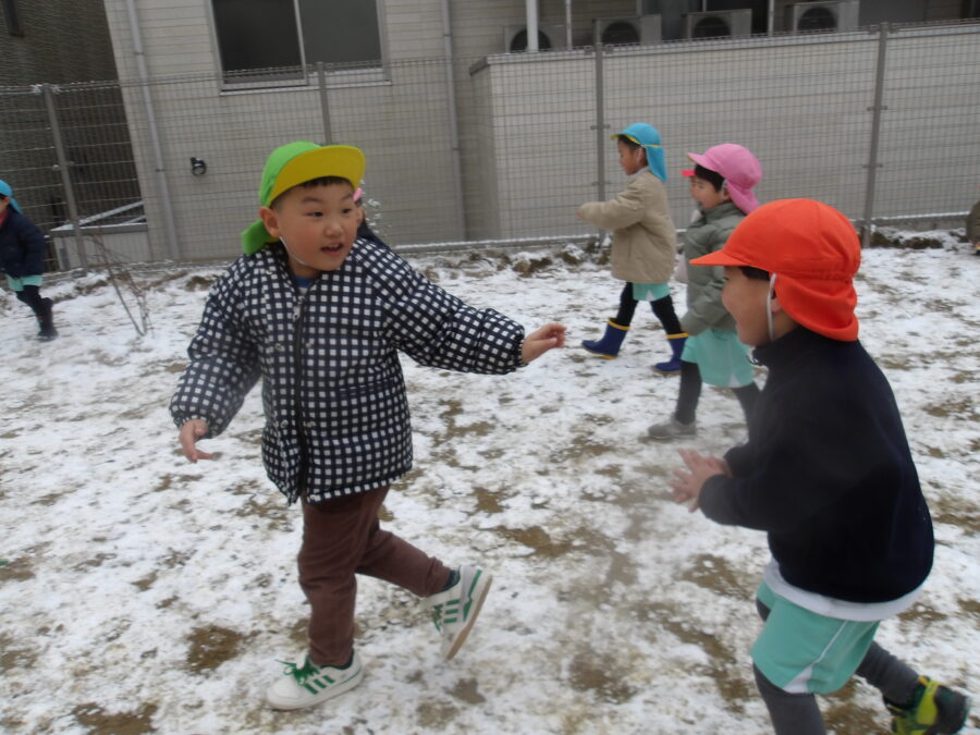 園庭では積もった雪を見て、外に出た瞬間に走り回ってたくさん足跡をつけていましたよ![]()