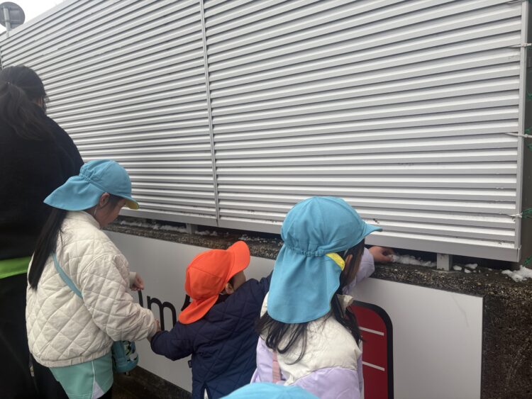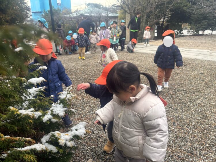 葉っぱの上に積もった雪をたいよう組さんと一緒に触ったり、先生とたいよう組さんが走って鬼ごっこをしているのを一緒になってついて走ったり、初めての雪の中の舎利殿を思う存分楽しみましたよ😊