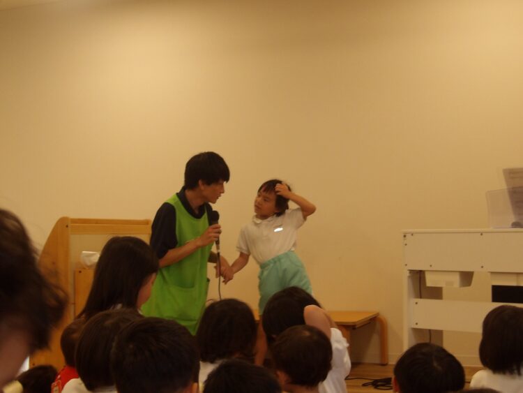 手遊びでは、皆前にいる先生の真似っこをして手を体を動かして楽しんでいましたよ♪