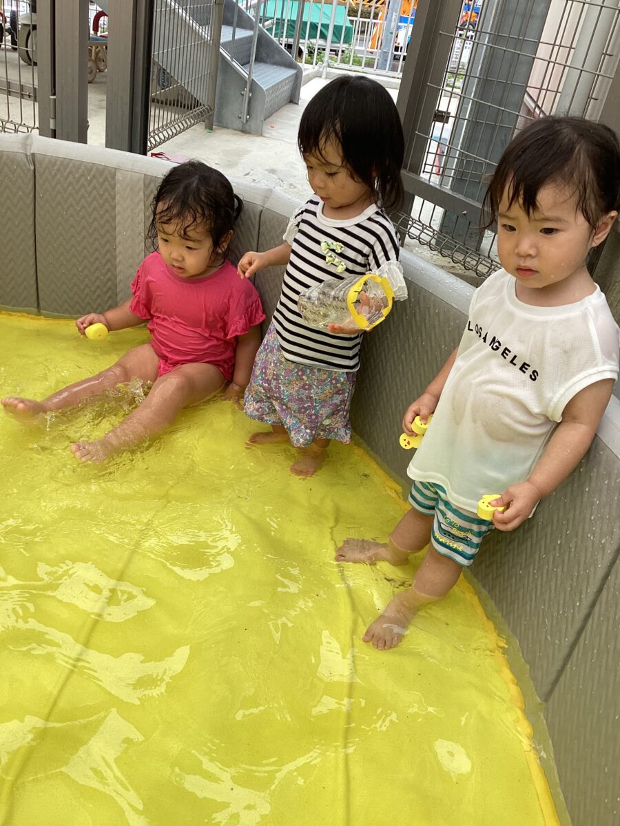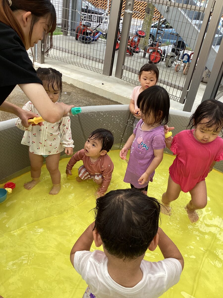 久しぶりの子や初めての子も最初は泣いてしまっていましたが、少しずつ慣れ、自分のしたいおもちゃや保育士と足をドボンドボンとさせたり、水鉄砲のお水を浴びたりして楽しみましたよ![]()