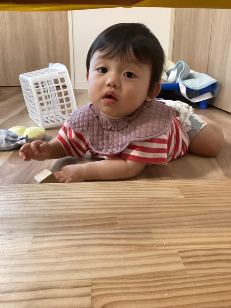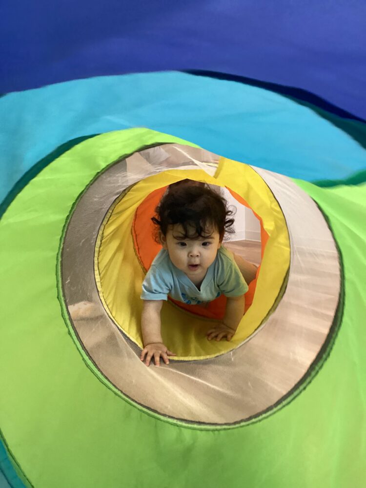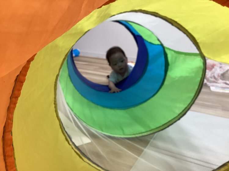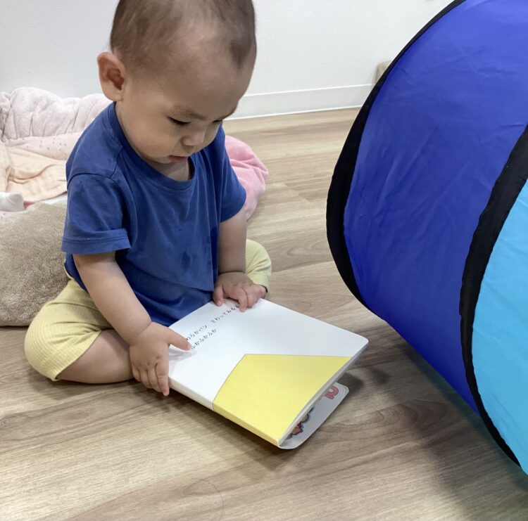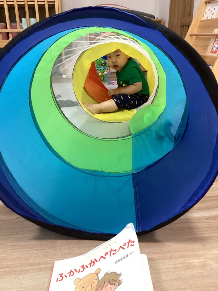 保育士の顔を見て微笑んでいました 絵本を広げて見ていますよ 初めトンネルの中に入るのは嫌だったのですが、お友だちのを見て楽しそうに見えたのかトンネルの中に入っていました 「先生僕ここにいるよ」と聞こえてきそうです。手を伸ばしていました はいはいが上手になり保育士の方にきてくれました