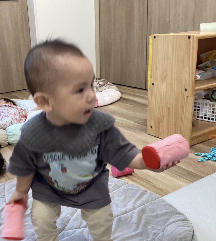 音の鳴おもちゃを持っておもちゃのチャチャチャの歌を歌うと上手に振って楽しんでいました![]()