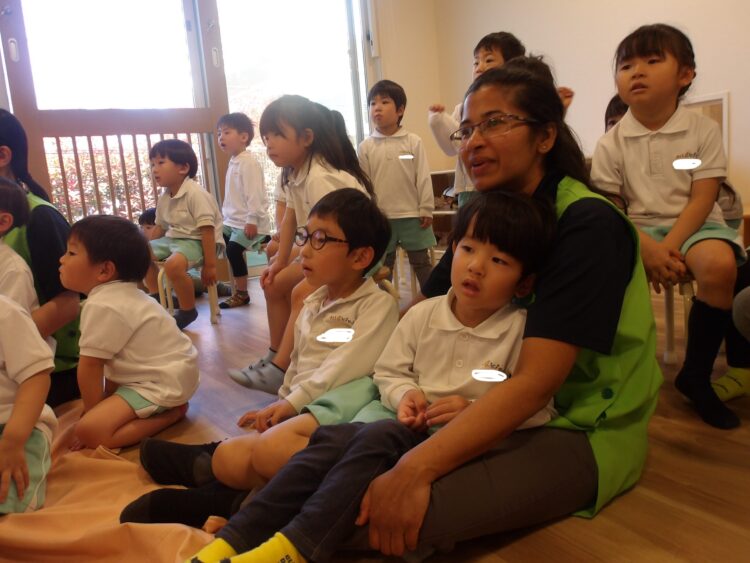 先生からは「かくれんぼ」の紙芝居を読んでもらい、いろんな先生のところからフルーツが出てきて…