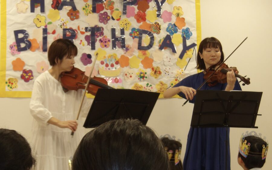 今日は、6月生まれのお友だちのお誕生日会がありました。今日の誕生会では、園児のお母様のヴァイオリンデュオによる