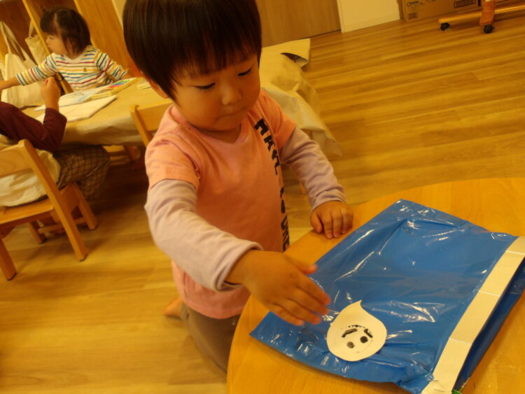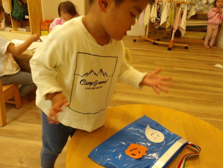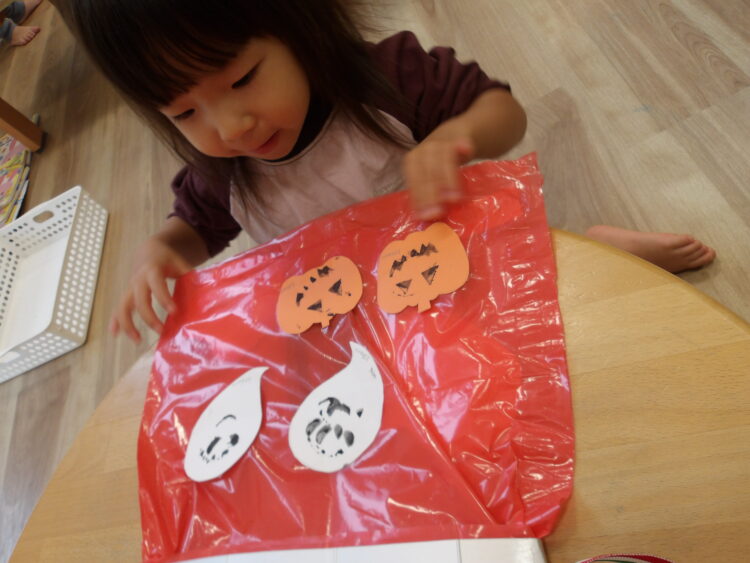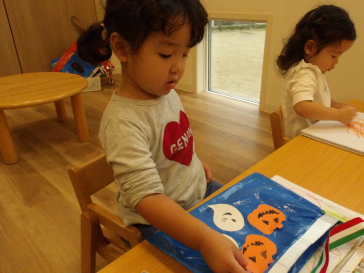 真剣な表情が可愛いです💕 うさぎ組はハロウィン製作。以前スタンプしたパンプキン、おばけをカバンに貼りました。これでハロウィン当日もバッチリです! 袋製作が終わったらお絵描きもしました😄