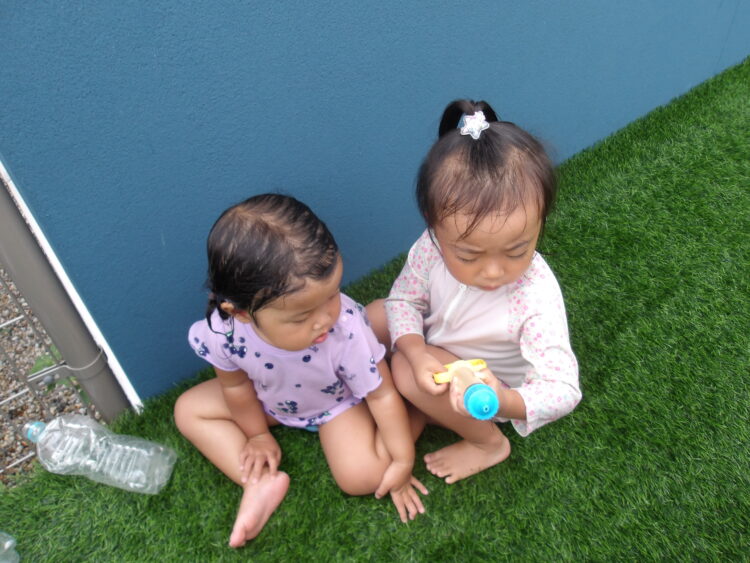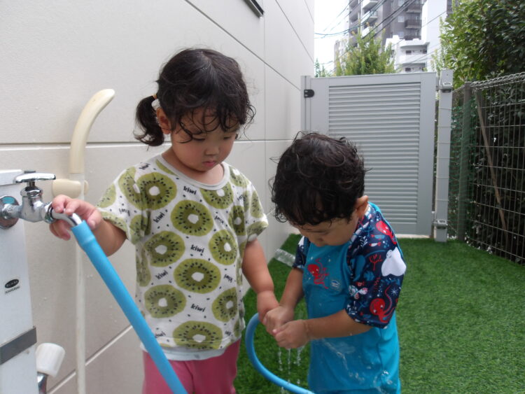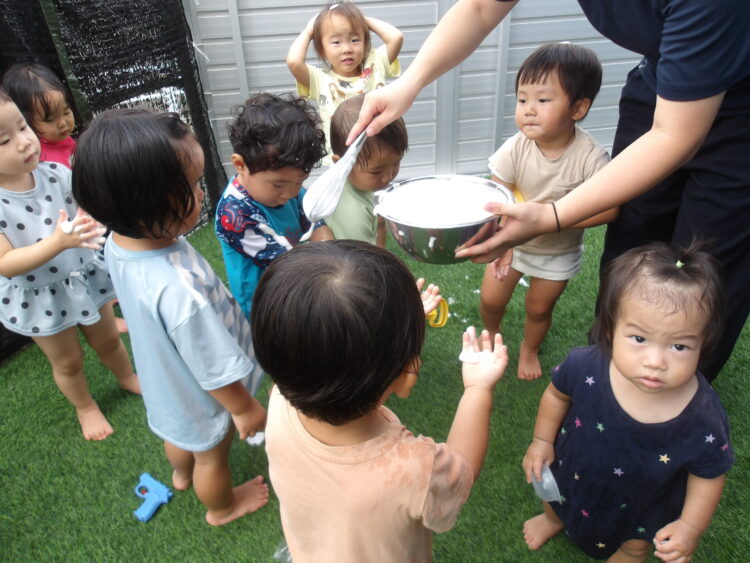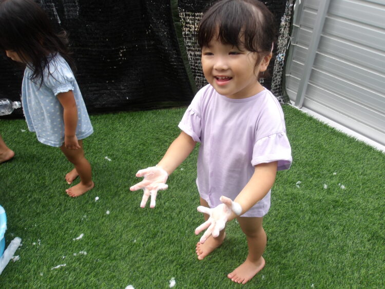 蒸し暑いのでテラスで水遊び。今日は石鹸を泡立てて泡遊び!いつにも増して大はしゃぎです!手にたくさん泡をつける子や