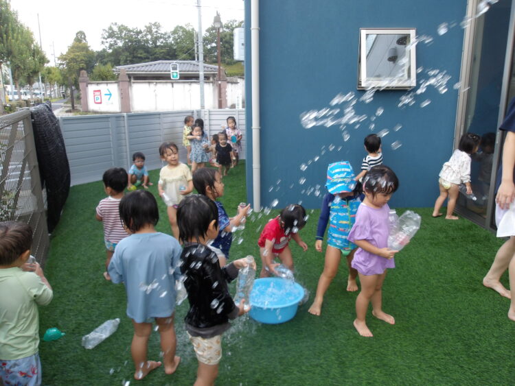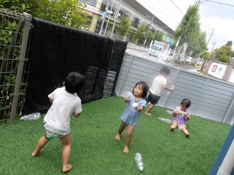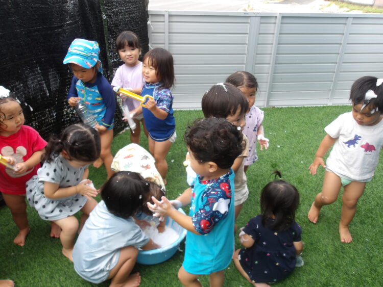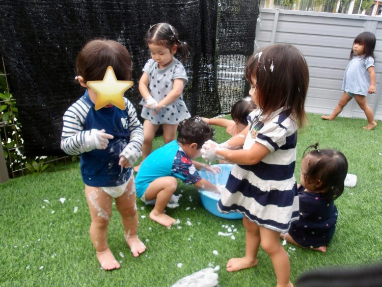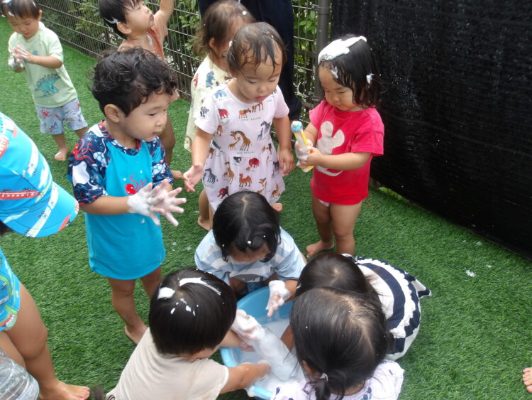 おもちゃを泡まみれにしたりする子、頭にのせている子や…
