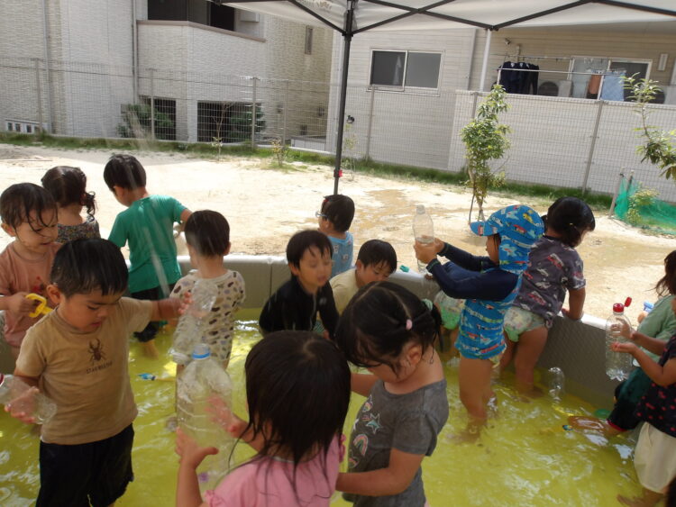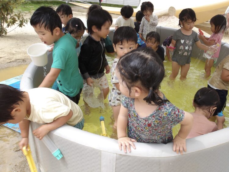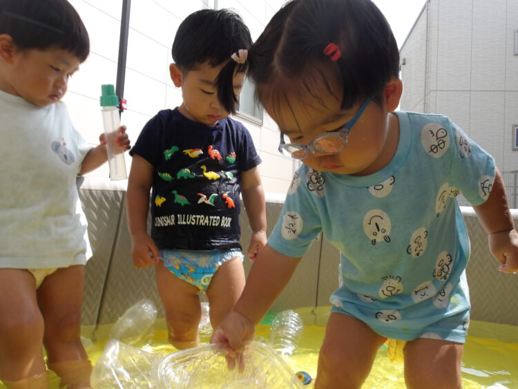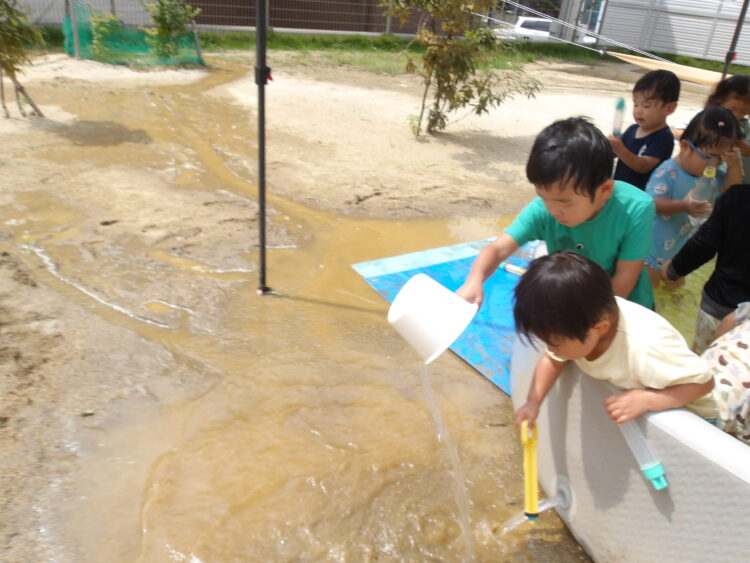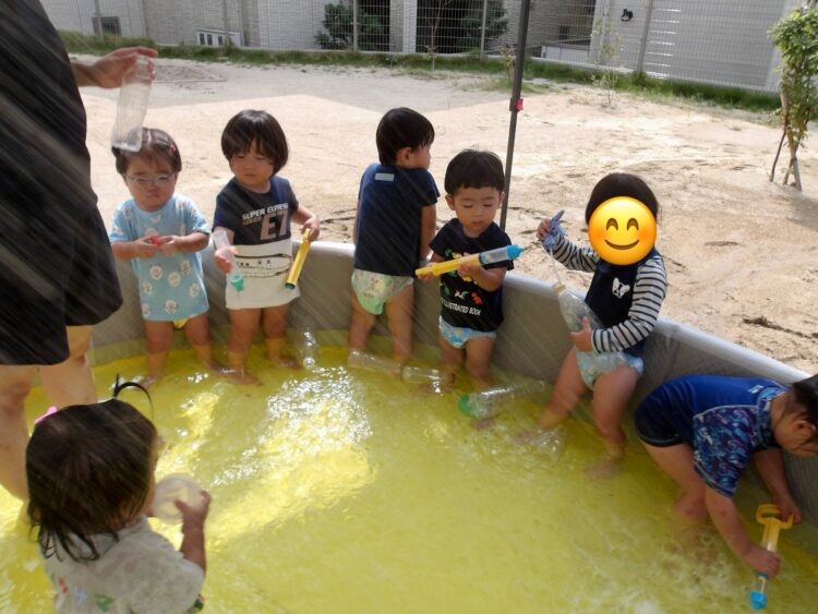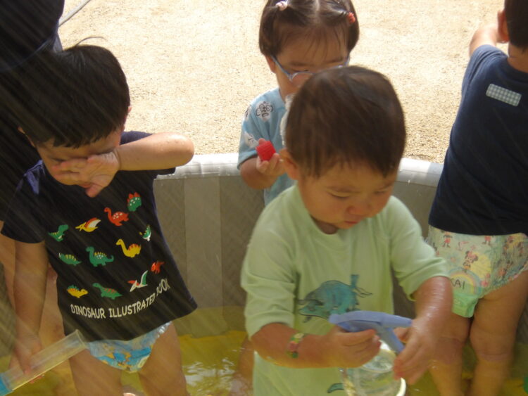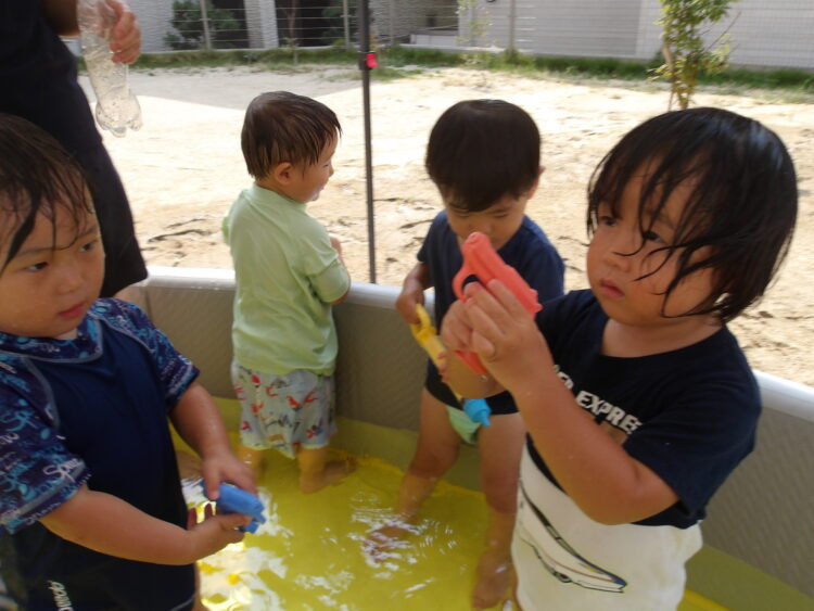 Splash!💦🔫💦🔫 今日もプールで水遊びをしました。水鉄砲やペットボトルをshakeしてシャワーをしたり元気いっぱいです! プールの水を抜くとできるどろんこの川はみんなのお気に入り!流れる様子をじーっと見ていますよ😊 カテゴリ: 覚王山(0〜1歳), 覚王山(2~3歳) タグ: