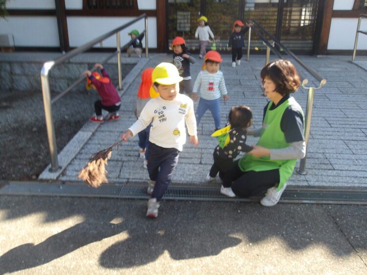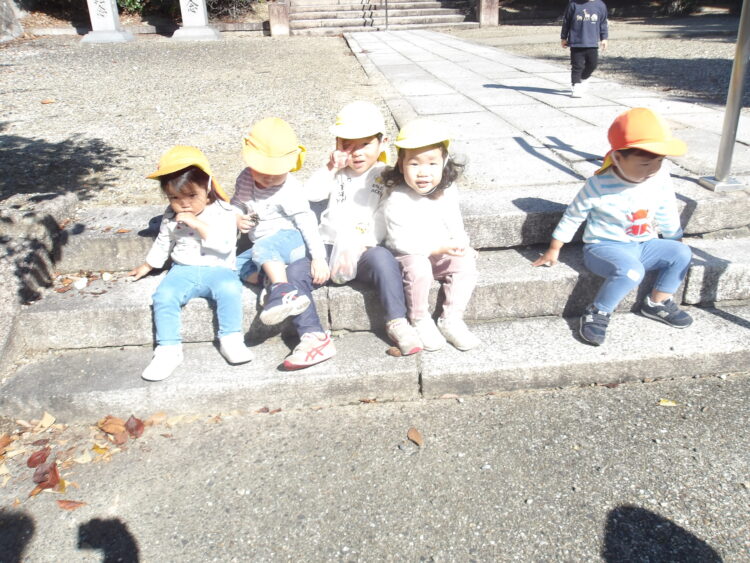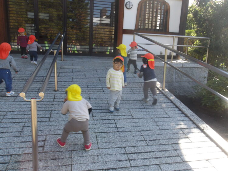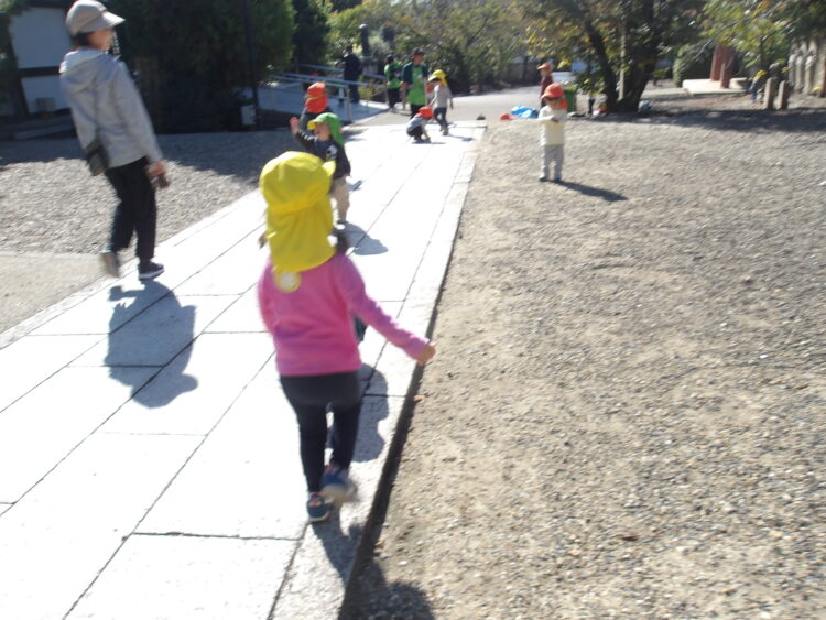 朝晩は寒くなってきてこの時期らしい気候になってきましたね。昨日の雨も上がり本日は晴れやかなお天気!ひよこ組、あひる組、うさぎ組で舎利殿に出かけましたよ。元気いっぱい走って体を動かしていますよ!
