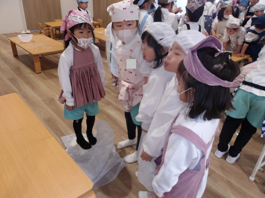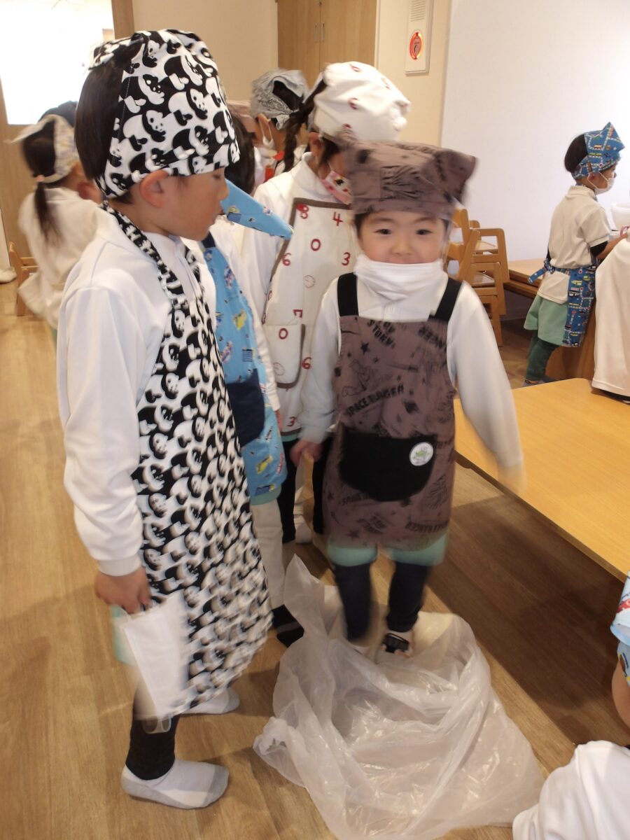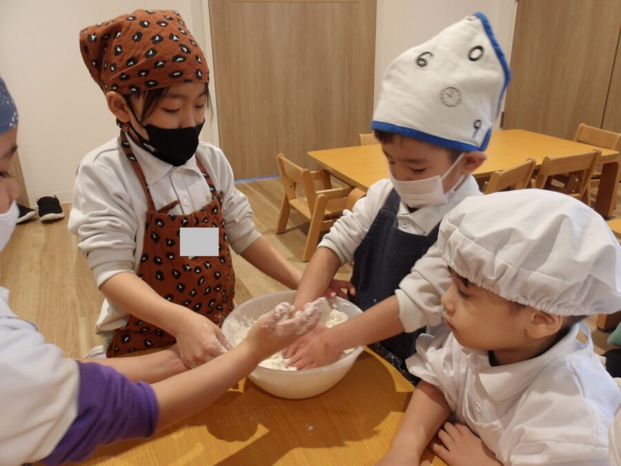 今日はたいよう組、にじ組、そら組のBグループのみんなでうどん作りをしました!