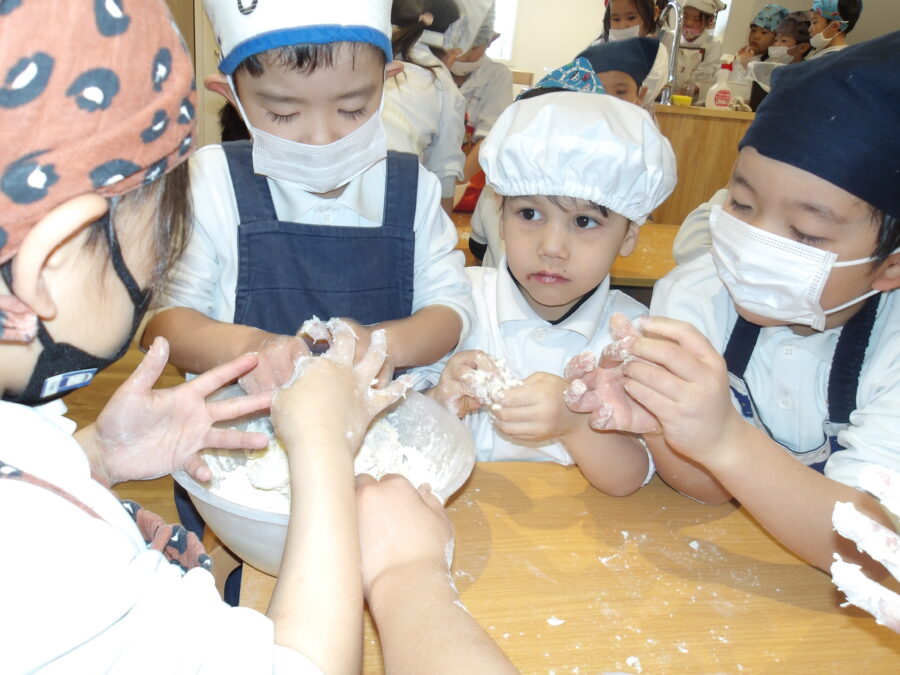 ボウルに材料の食塩水と強力粉、薄力粉を混ぜ、だんだんまんまるの生地が完成すると「見て!」と嬉しそうにしていました