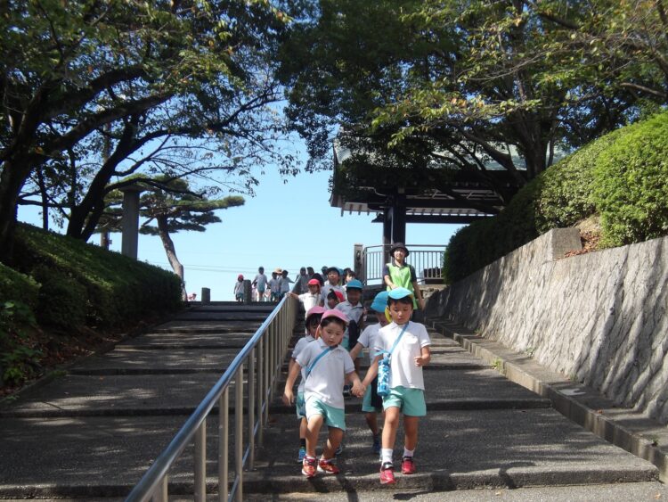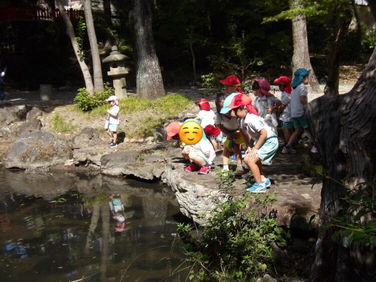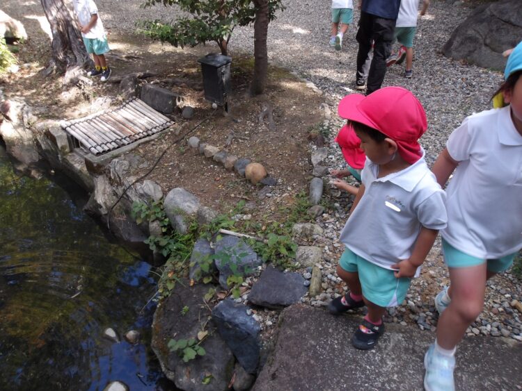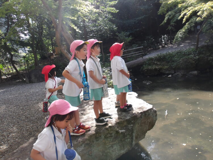 池にいる鯉を眺めたり、どんぐりを拾ったり、お友だちと一緒に鬼ごっこをしたりと思い切り身体を動かすことができました