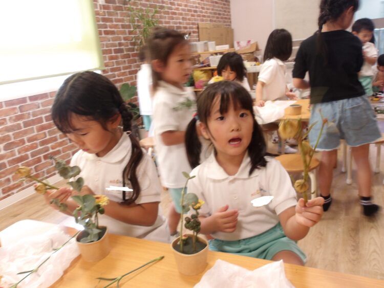 今回のお花は、フウセントウワタ、ケイトウ、ユーカリ、スプレーマムなど色々なお花を使って楽しみました