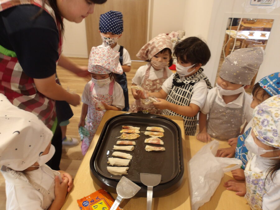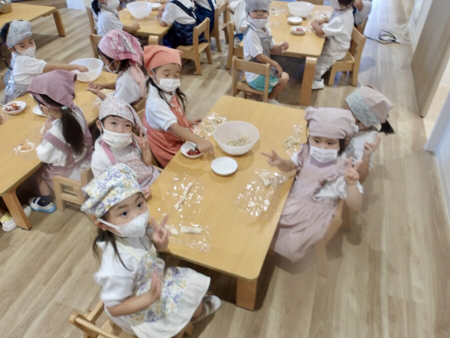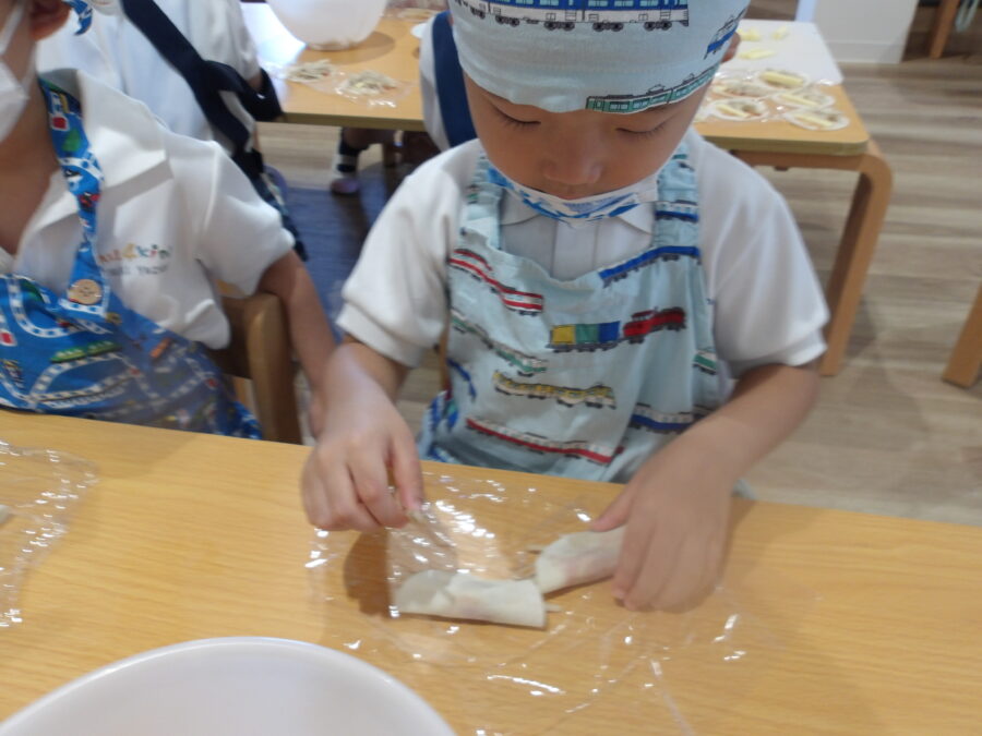 「お家でやってるからさ〜?」と巻くだけでなく餃子の形にチャレンジするお友だちもいましたよ