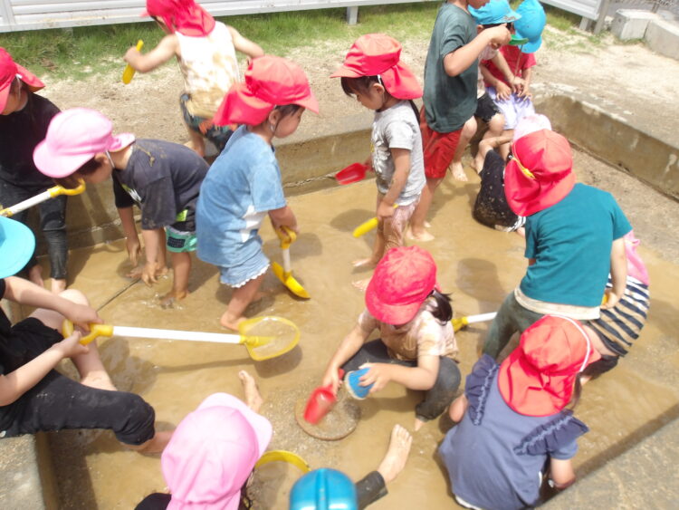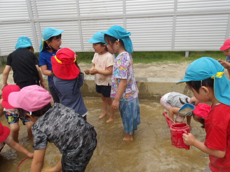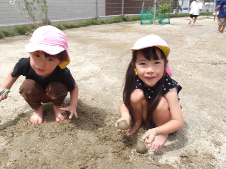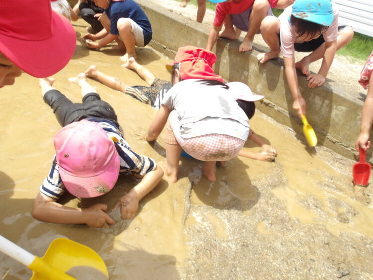 「水が冷たーい!」と言いながら、泥の中に入って足をぴちゃぴちゃしたり、泥パックをしたり、泥団子をつくったり、体全体で泥の感触を味わいました!