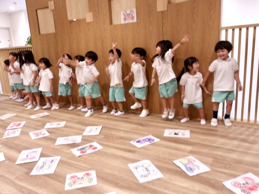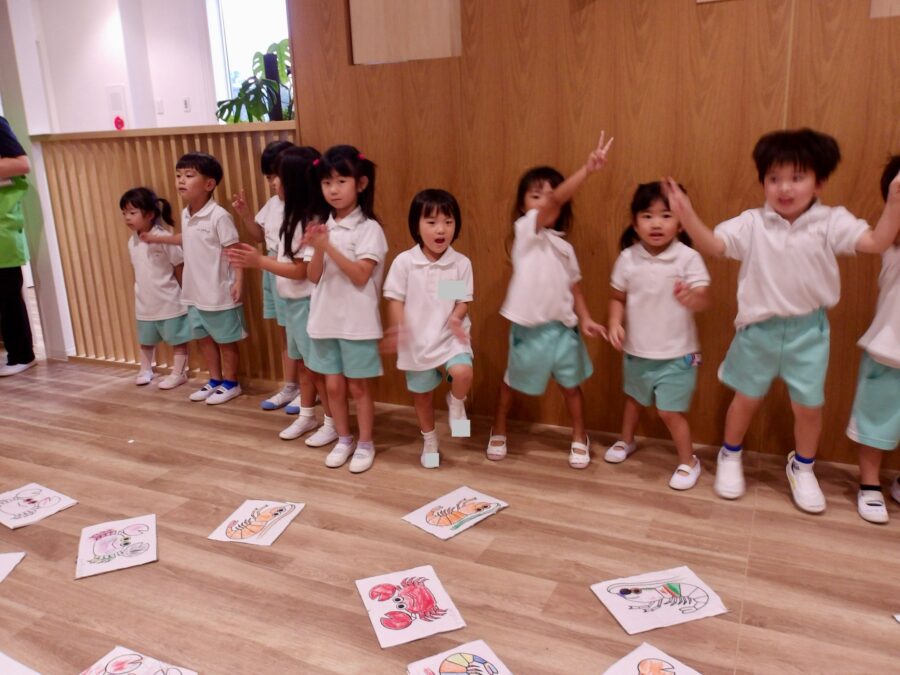 元気にエビカニダンスを踊って、、音楽が止まると「えびえび!!」「カニ、!」と言いながら一生懸命カードをめくっていました☺️