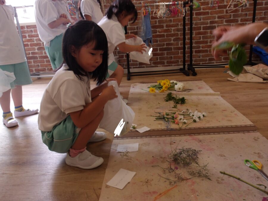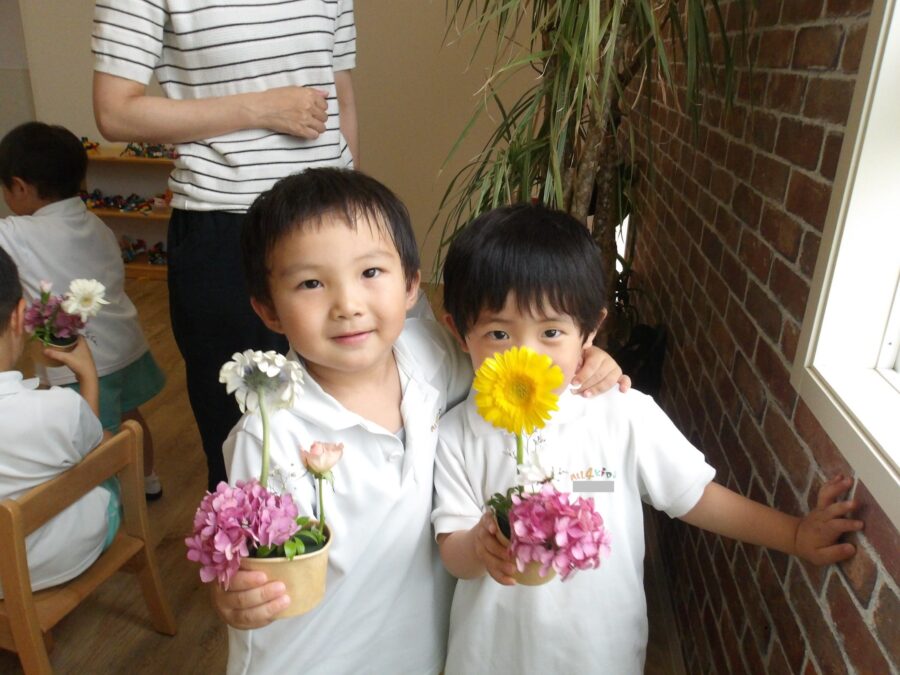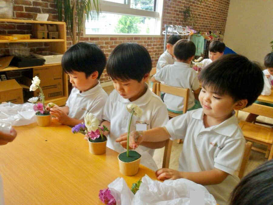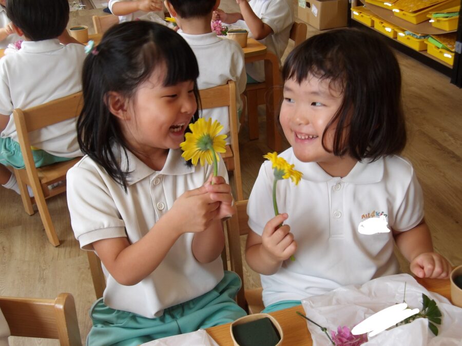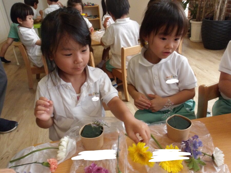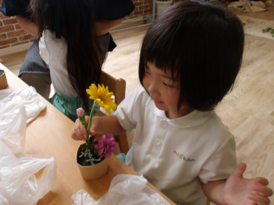 選んでから挿すまでの間、「いい匂いがする〜!」「ピンクにしたよ!」とお友だちと話したり、挿すときにはお花の名前を呟きながら挿していました