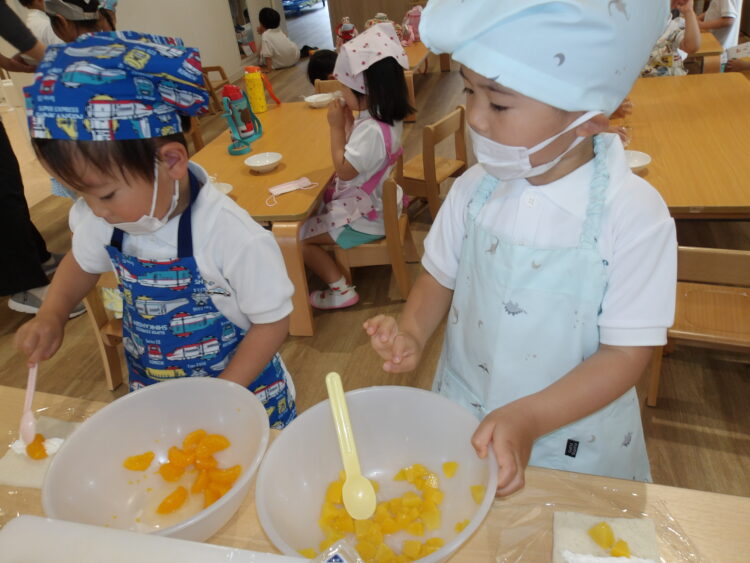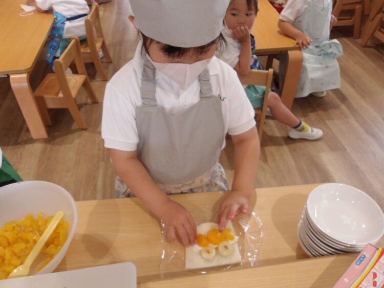 食パンにホイップクリームを絞り、そこへバナナや桃、みかんをのせます。