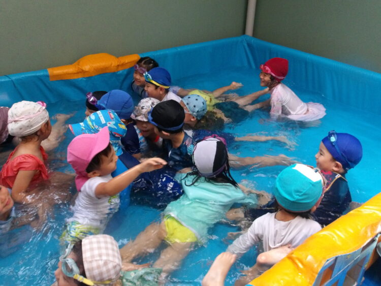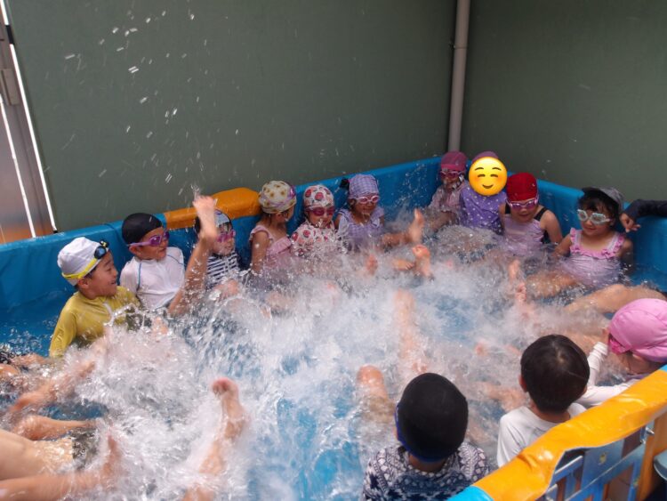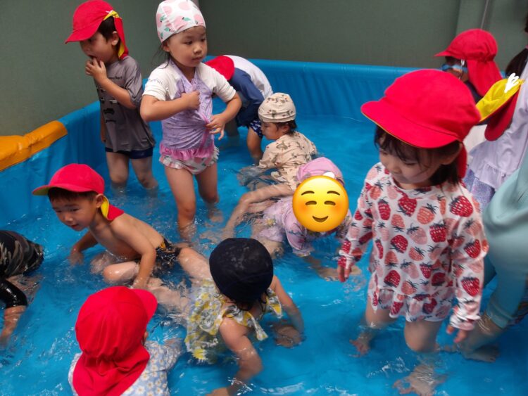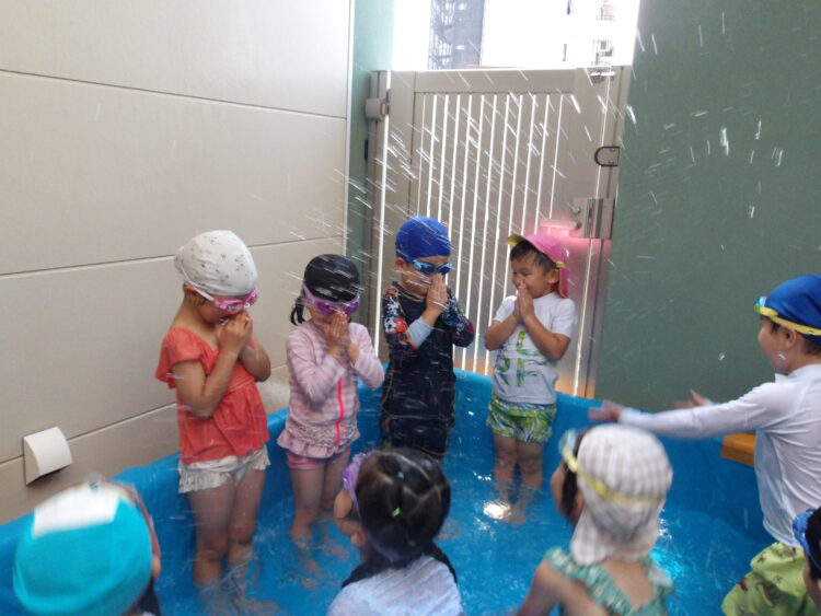 ワニさん歩きをしたり、プールの中を走り流れるプールをつくったり、花火水鉄砲を使って遊んだりしました![]()