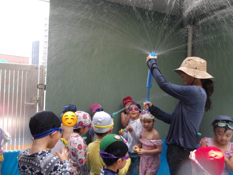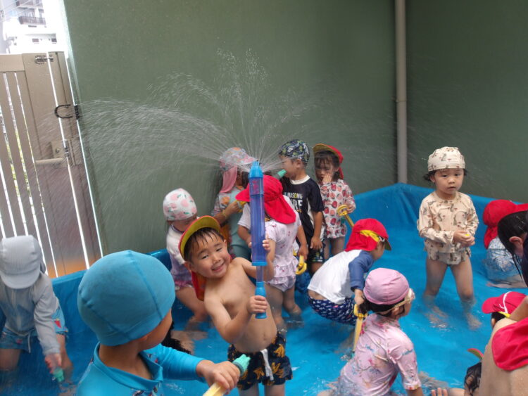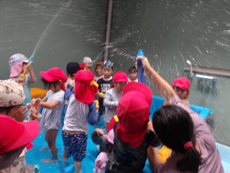 新しい水鉄砲では、花火のように水が噴射され、みんなワクワク楽しんでいました✨