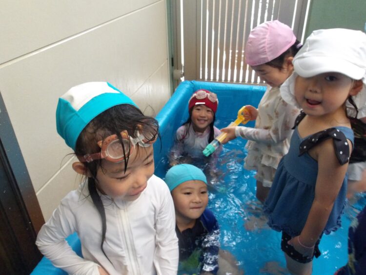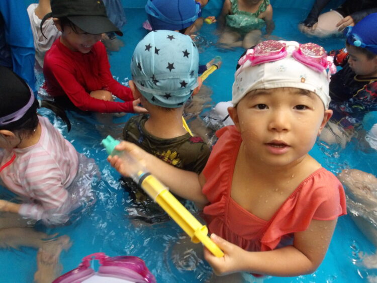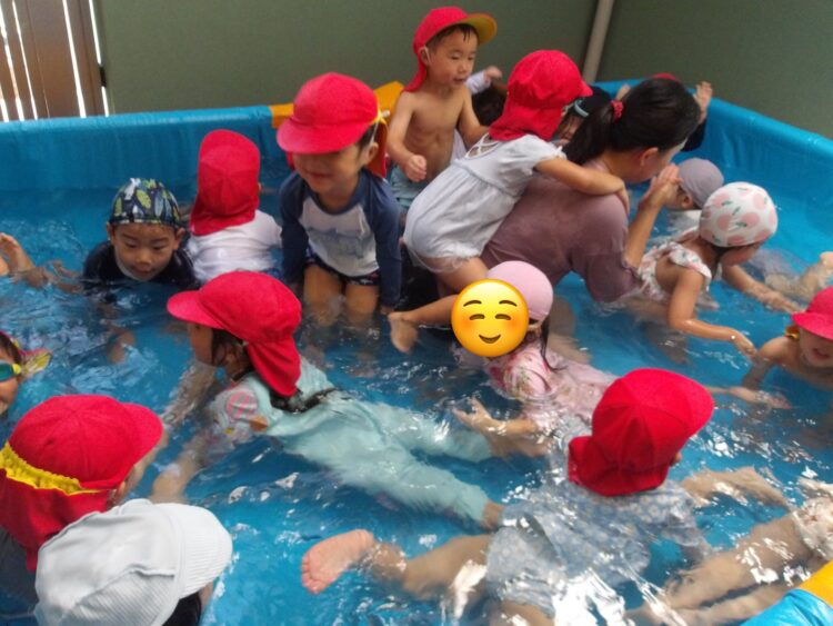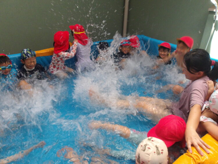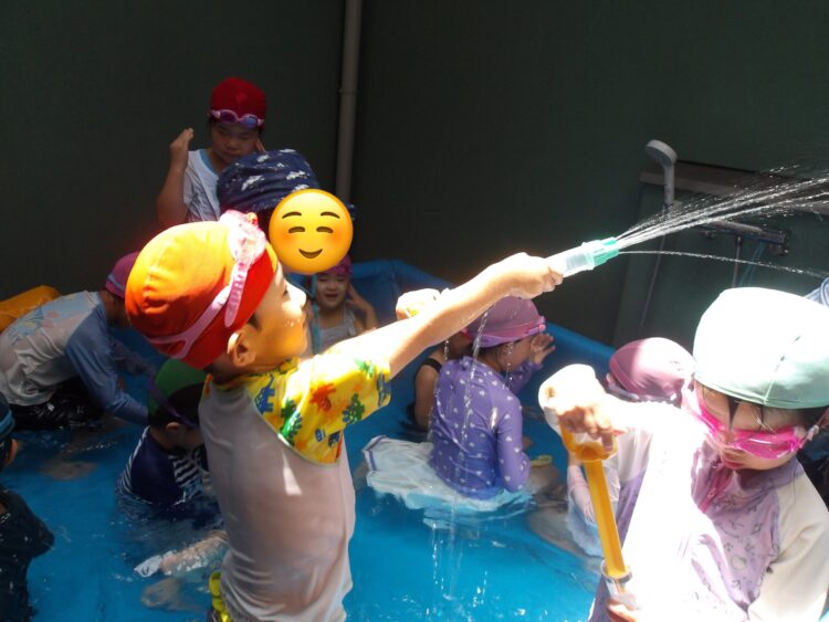 暑い日が続く中、今日もプール遊びをしました バタ足をして大きな水しぶきをつくったり ワニさん歩きでプールの中を散歩したり🐊 水鉄砲を使って水遊びをしたり 元気よく体を動かして、楽しく活動ができました✨ 明日も楽しみだね☺️