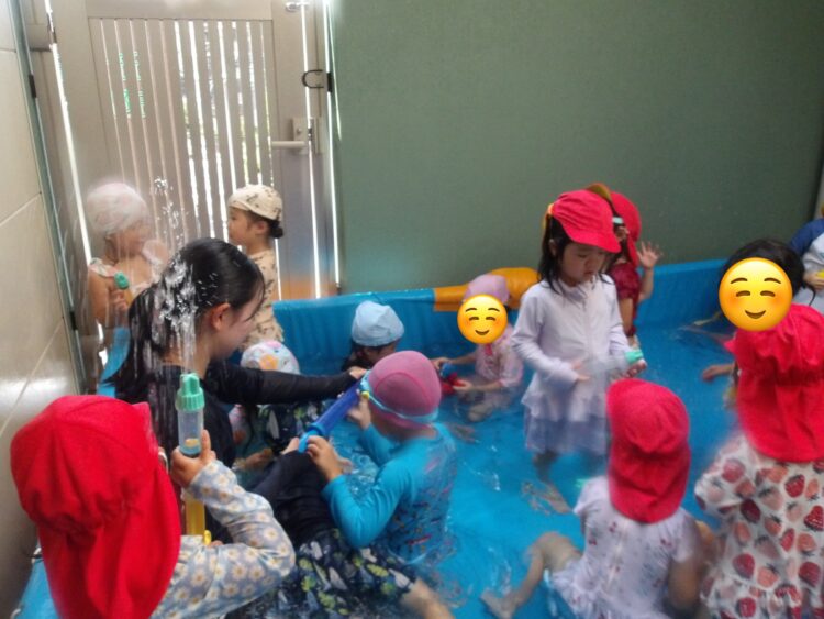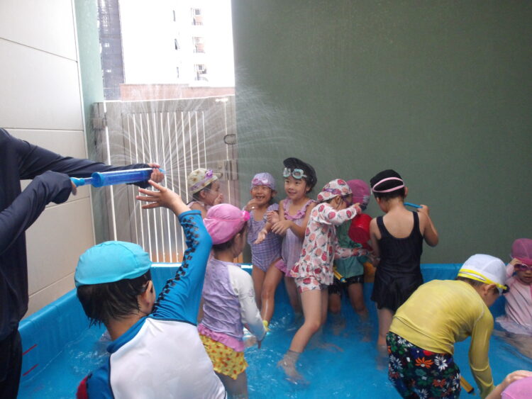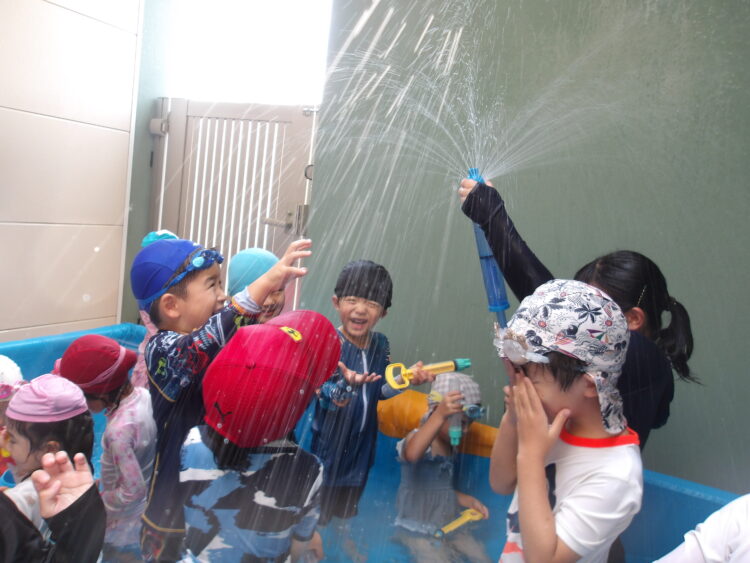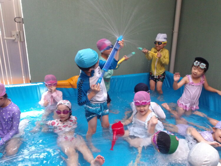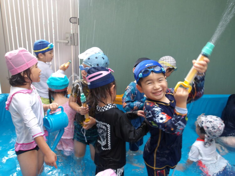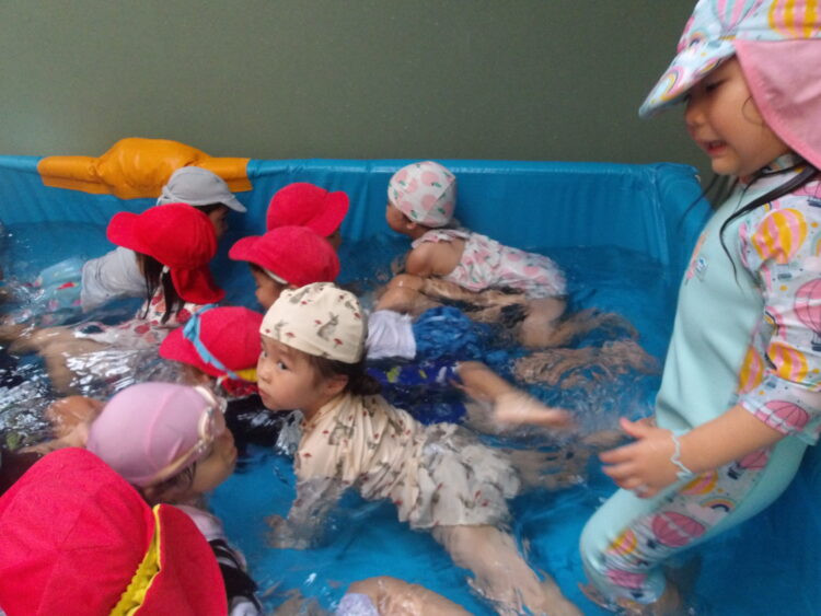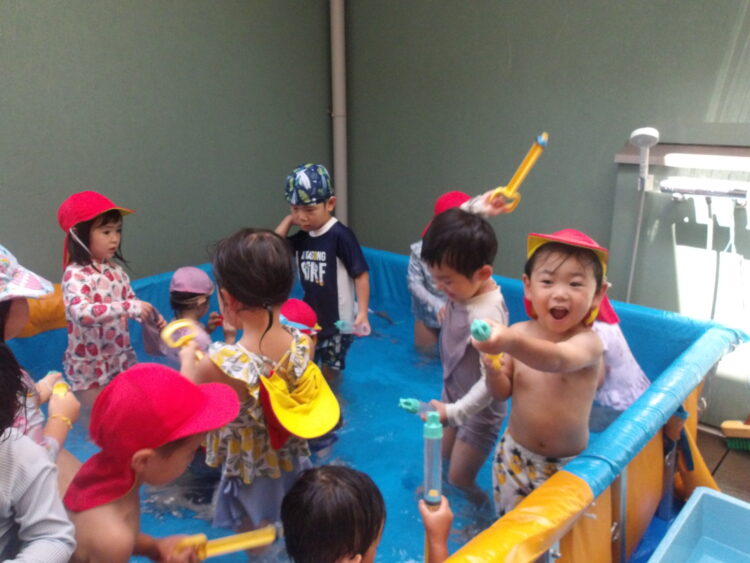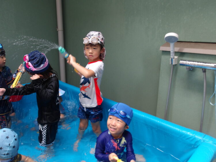 今回もバタ足やワニさん歩きの他に、水鉄砲やジョウロを使って時間いっぱい楽しみました