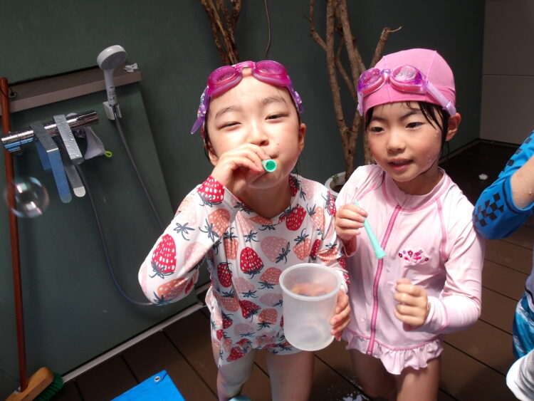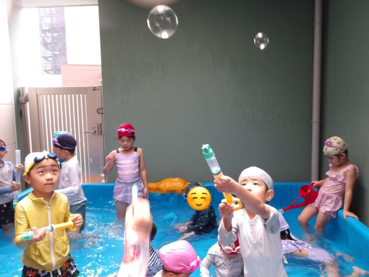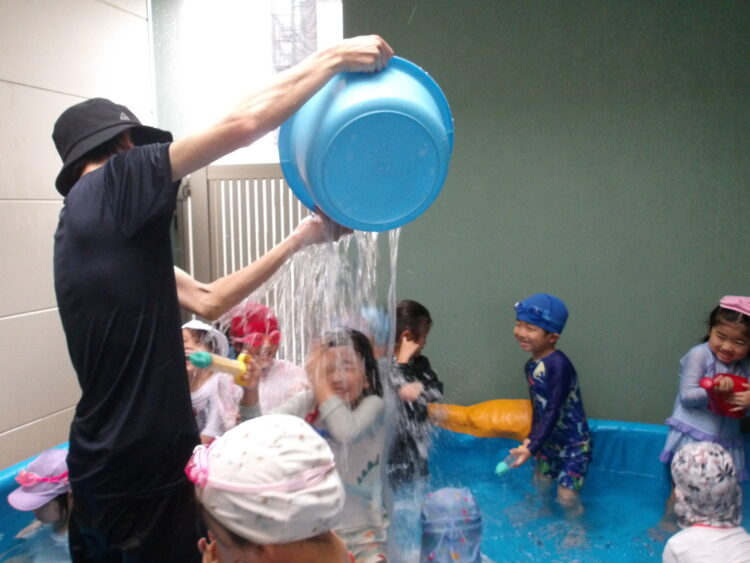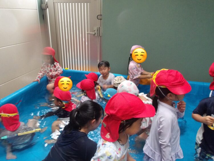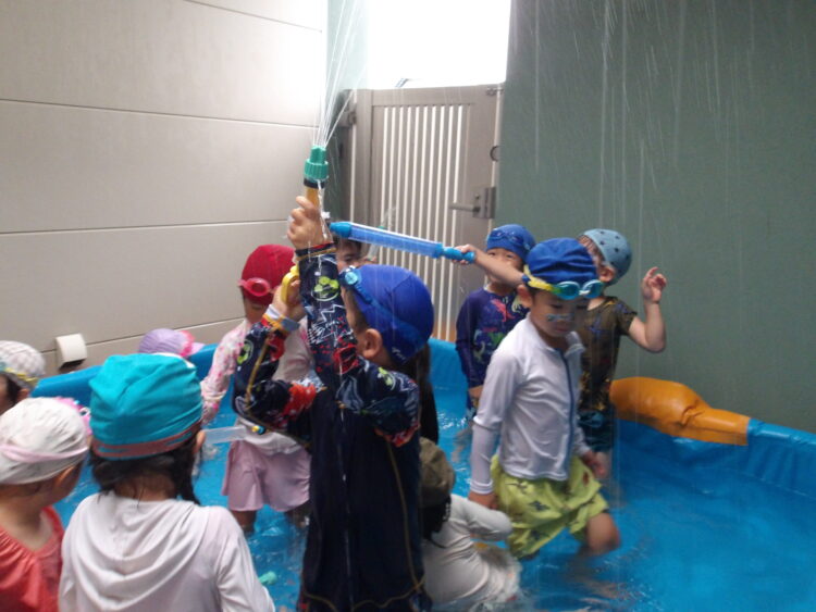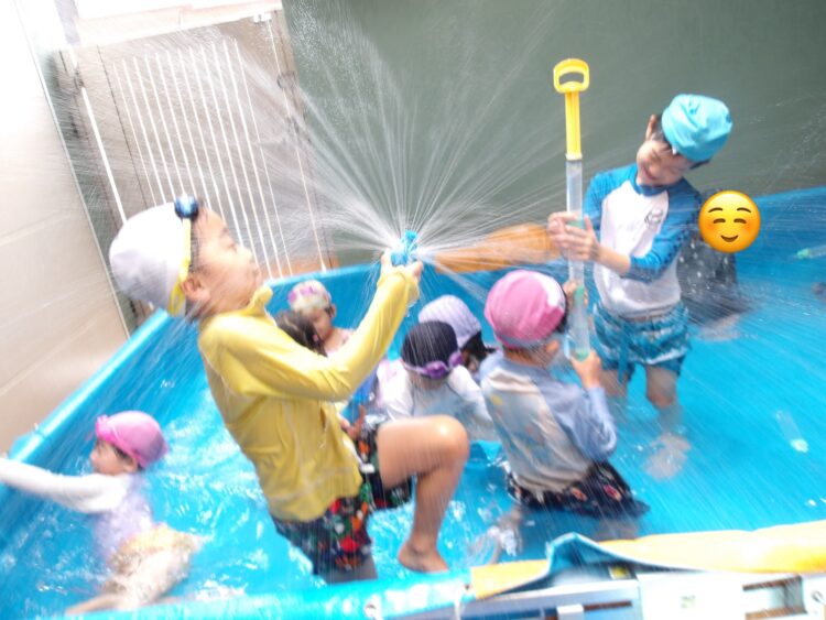 子どもも先生もベタベタになりながらプール遊びを全力で楽しみました