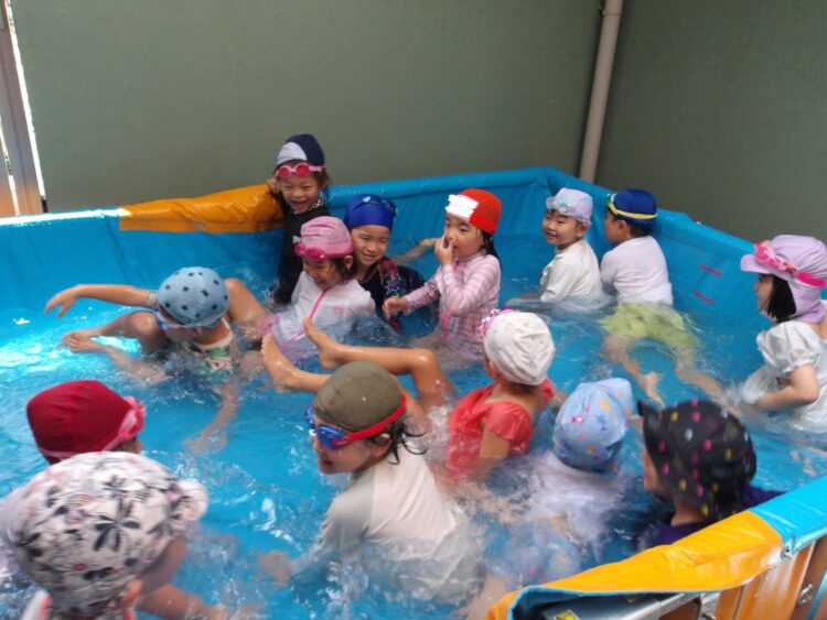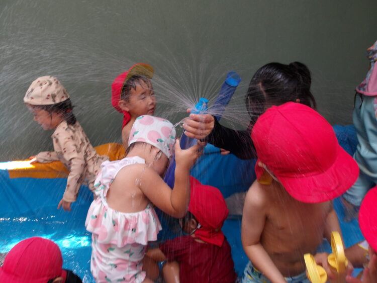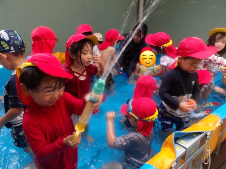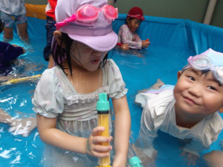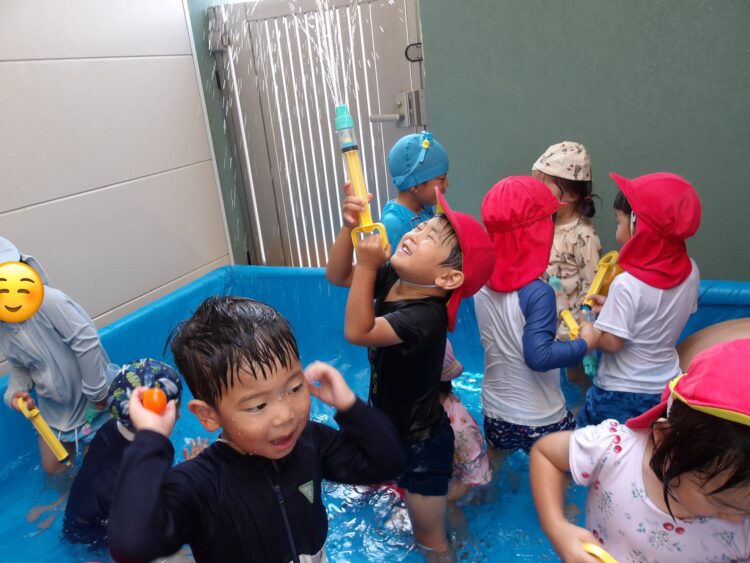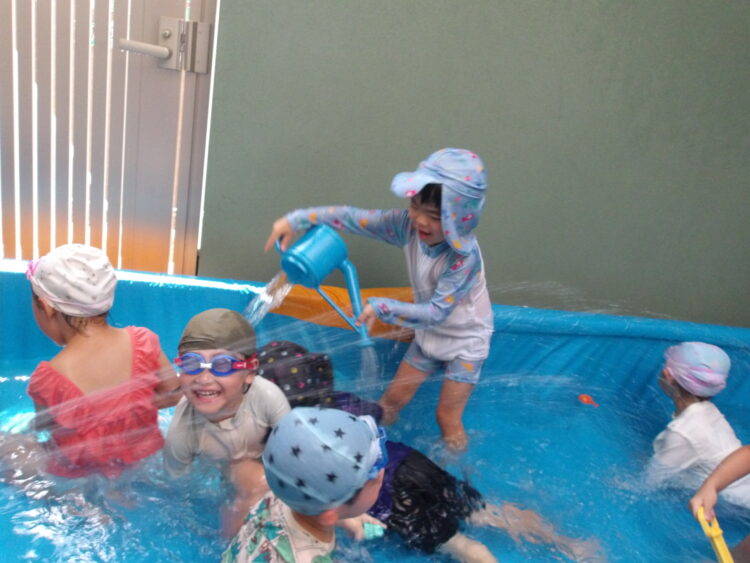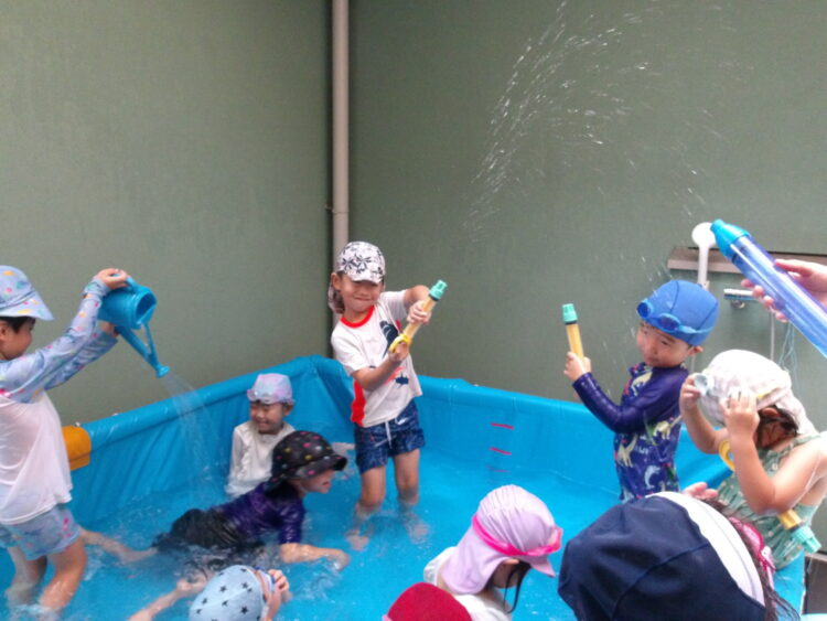 プール遊び🏊♀️ そら組さん、にじ組さんは今日もプール遊びをしました お友だちと水をバシャバシャかけ合ったり、水にお顔をつけることに挑戦したり、水鉄砲で遊んだり、全力で楽しむことができました 8月もたくさん楽しもうね カテゴリ: 覚王山(2~3歳), 覚王山(4~5歳) タグ: