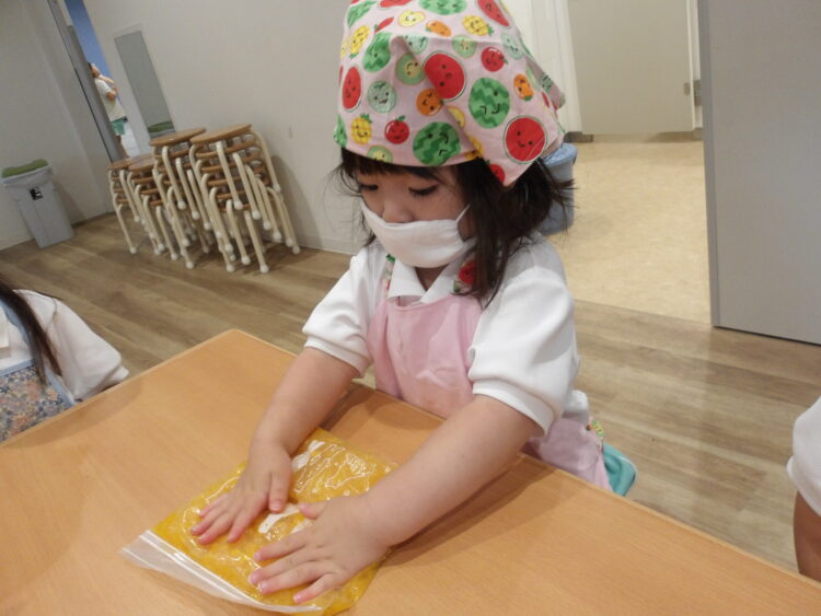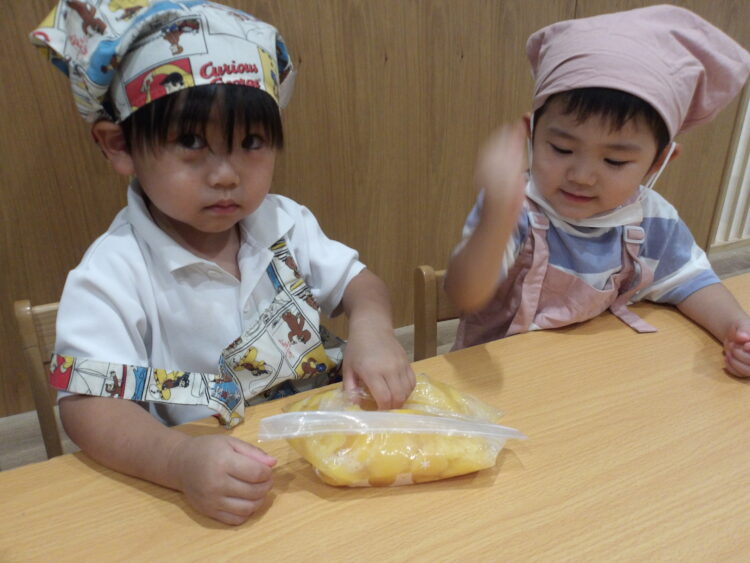 今回は桃缶、みかん缶、バナナを保存袋に入れてもみもみ!