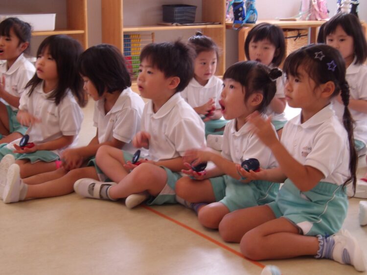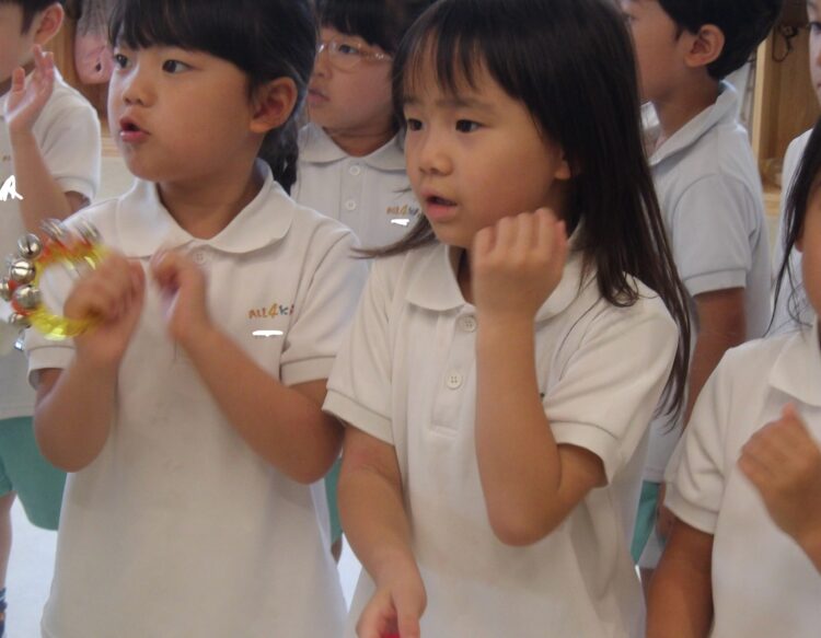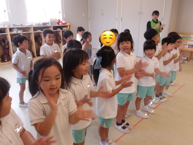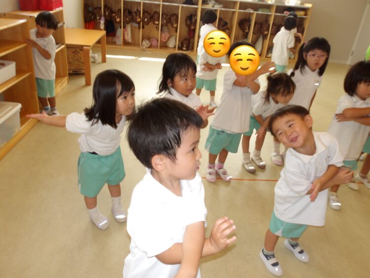 先生の話を聞いてリズムに合わせたり歩いたり手を叩いたり