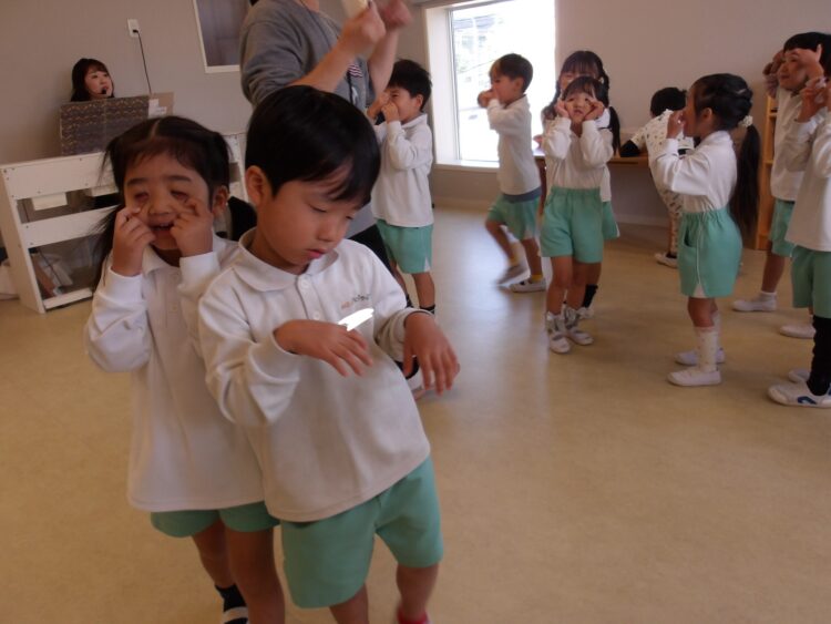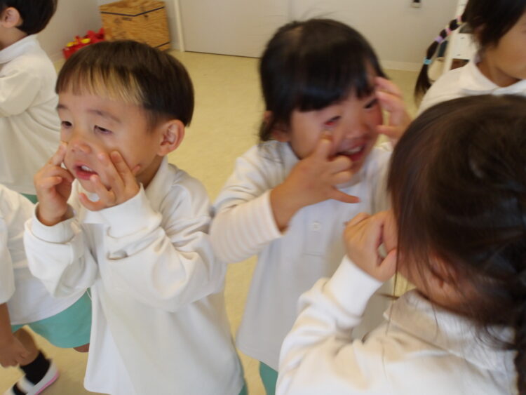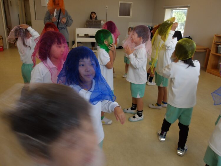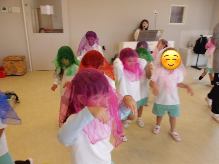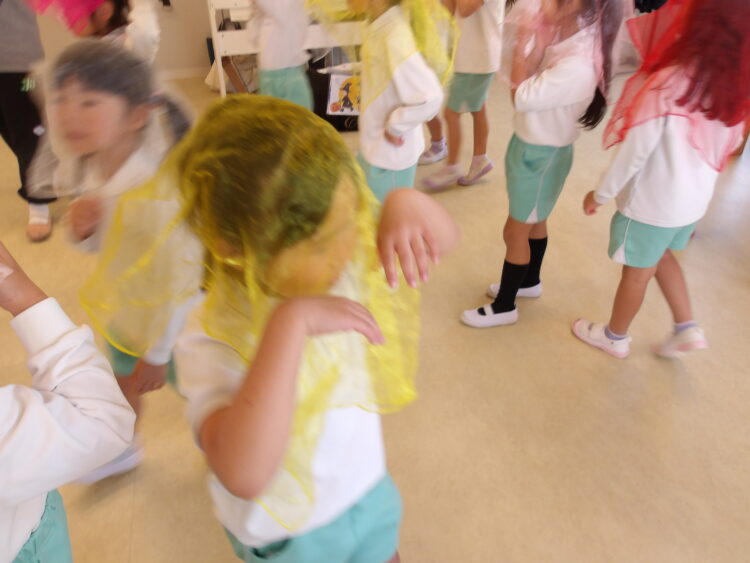 ハロウィン🎃をテーマに、スカーフのランプを持って森の中を歩きました!その途中で魔法にかかっておばけ👻になったり、フランケンになったりしました!みんなノリノリでいろんなものに変身していました!