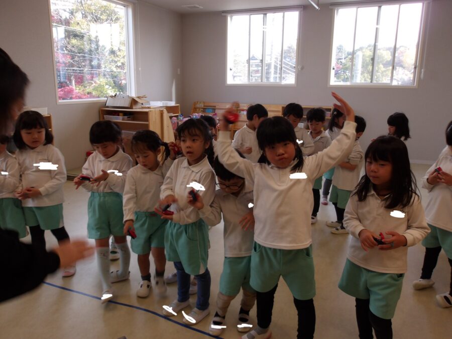 今回はクリスマスが近いことから、クリスマスに関するお話しを聞きながらリトミックに参加したり、クリスマスソングに合わせて楽器を鳴らしましたよ