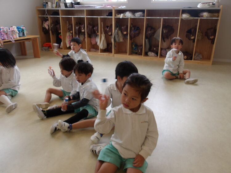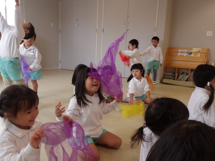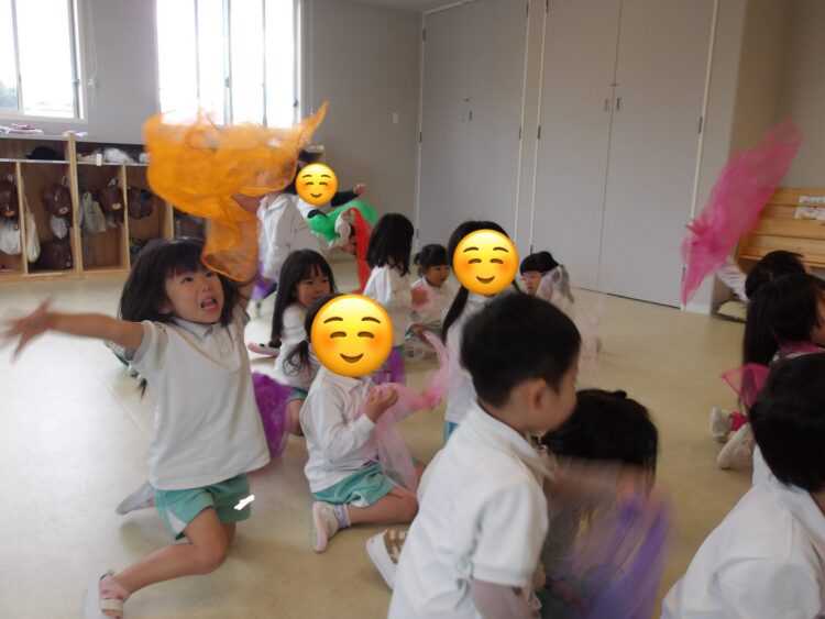 両手を大きく広げてトンボに変身したり、マラカスを使っていろいろな「虫のこえ」を奏でたり、スカーフを葉っぱに見立てて空にふわっと投げたりしました![]()