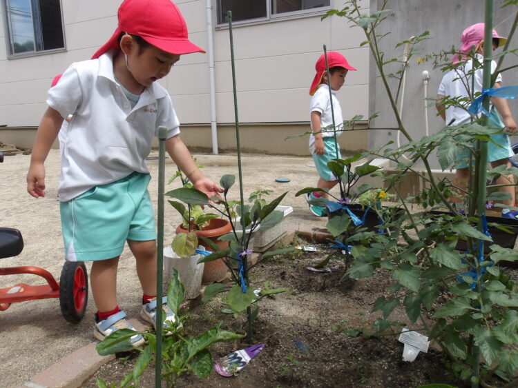 園庭では、夏野菜の成長を観察したり