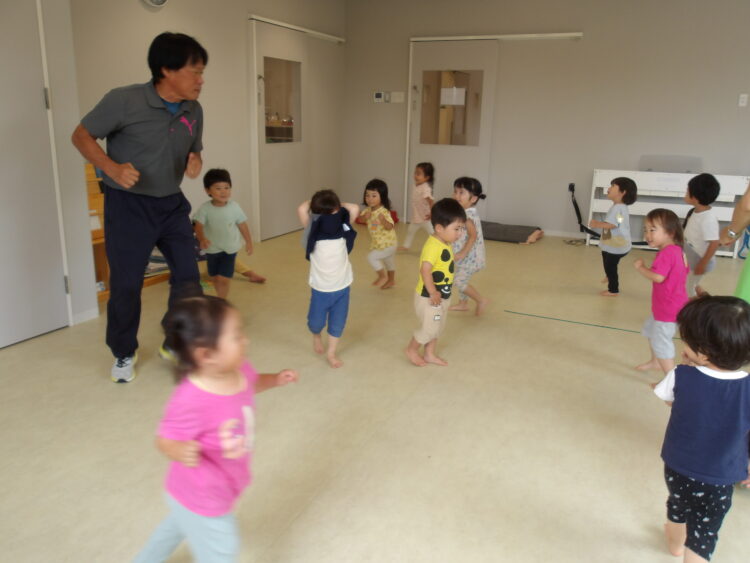体操教室がありました。準備体操はまずみんなで走ります!