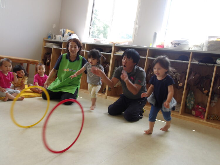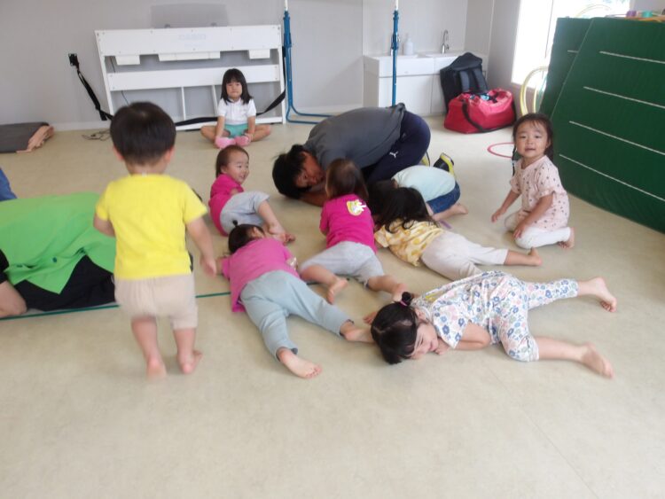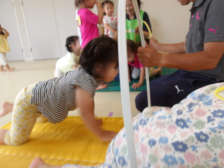 続いてはフープを使った運動です。立ってくぐったり、みんな赤ちゃんに👶🏻変身してハイハイでくぐりましたよ😊