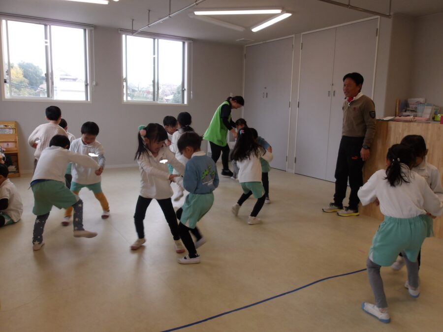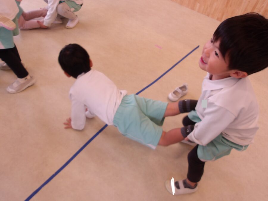 たいよう組さんは二人組になって足をお互いに狙い、踏んだり相手をかわして素早く身体を動かすことに挑戦しました![]()
