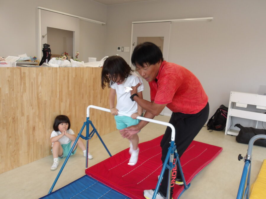 腕の力を使って鉄棒の上に乗ったり、後ろにジャンプしました