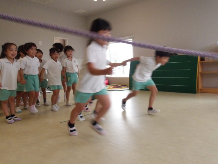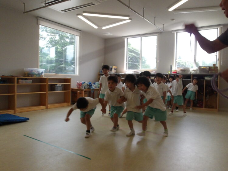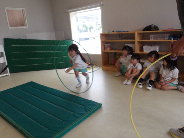 体操教室! 今日の体操教室では、フープや縄を使いました! 転がるフープの中を通り抜けたり 縄の上をジャンプしたり お友だちと手を繋いで、縄の通り抜けもしました! カテゴリ: 覚王山(2~3歳), 覚王山(4~5歳) タグ: