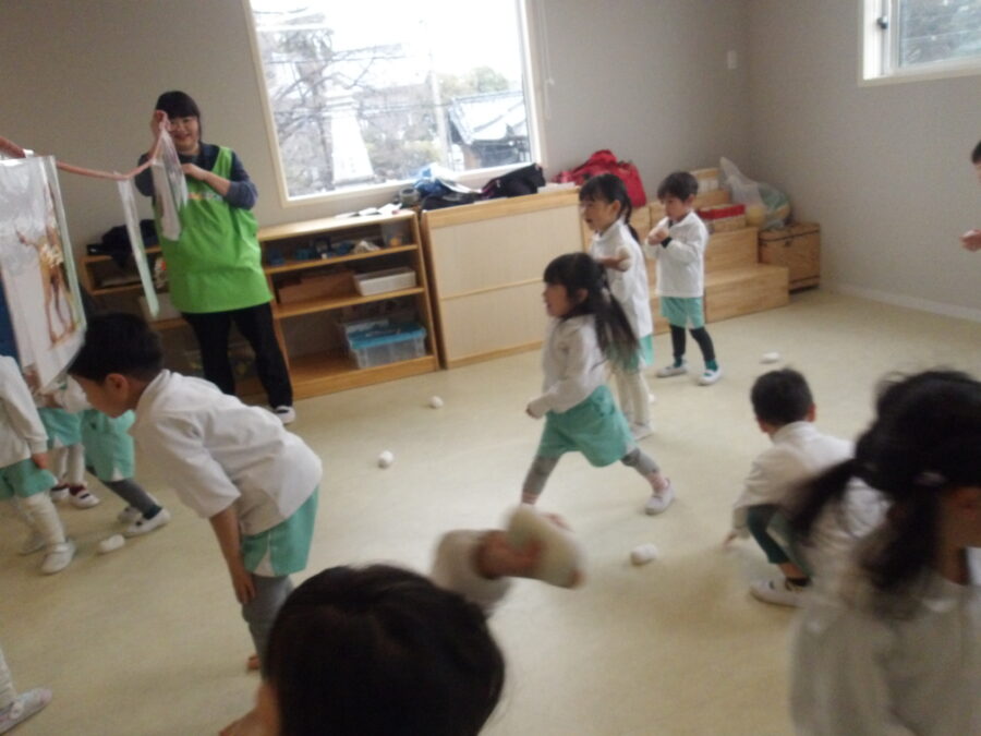 まずは5人チームを作りお友達にボールを投げ合っていました✨