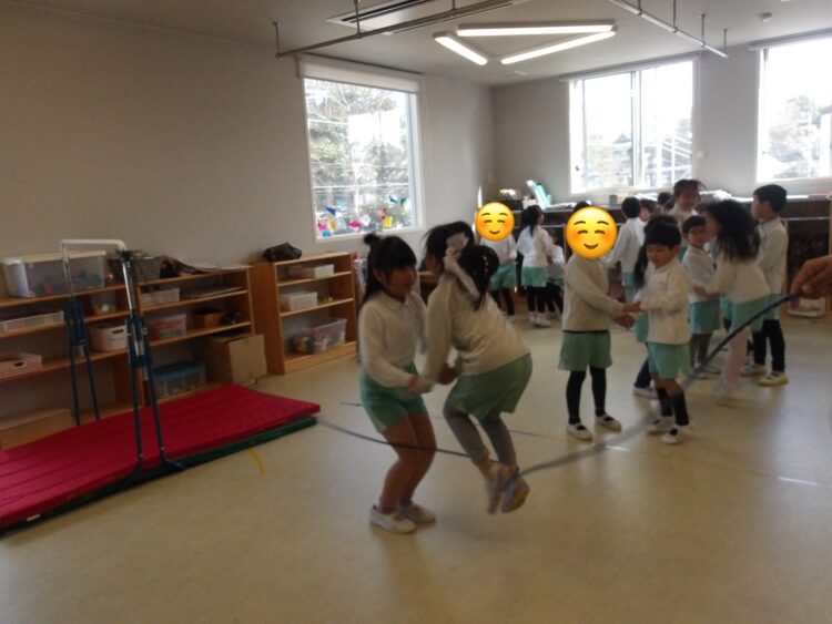 たいよう組さんは、二人で手を繋いで大縄を跳んだり、ボールに当たらないように逃げたりしました![]()