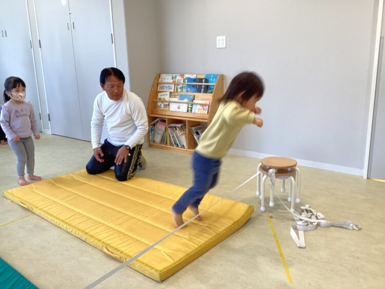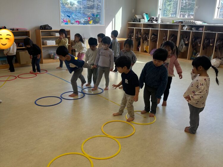 4つ並んだフラフープをジャンプしたり、片足で通ったり、けんけんぱなど色々な飛び方で進んでいました!