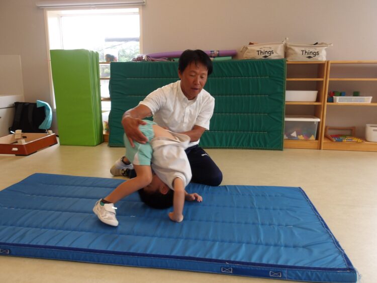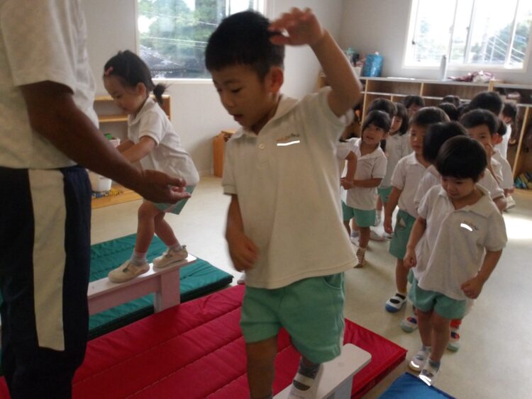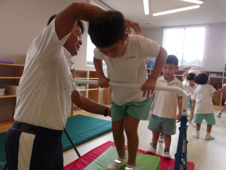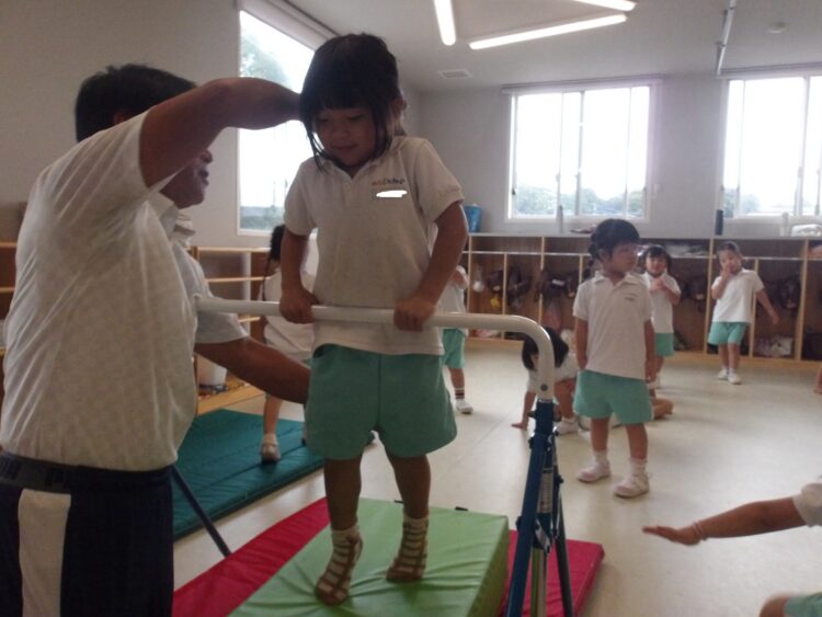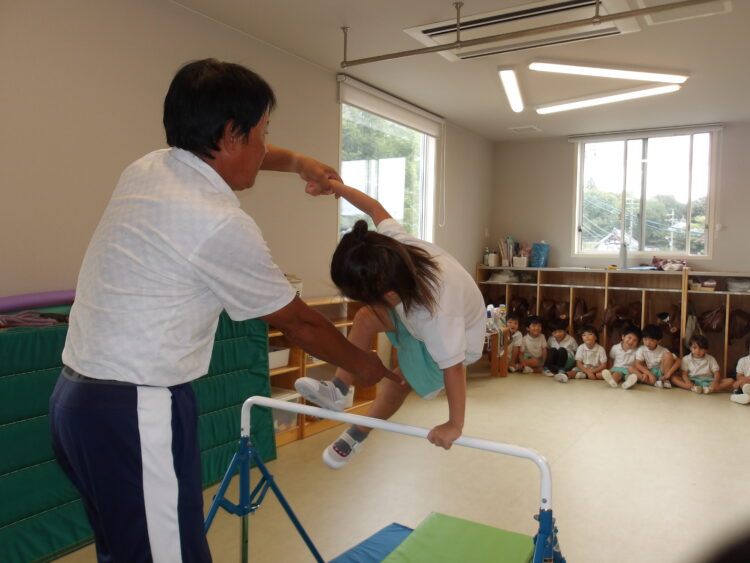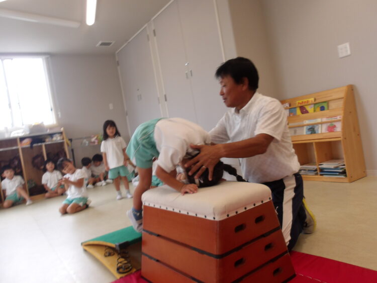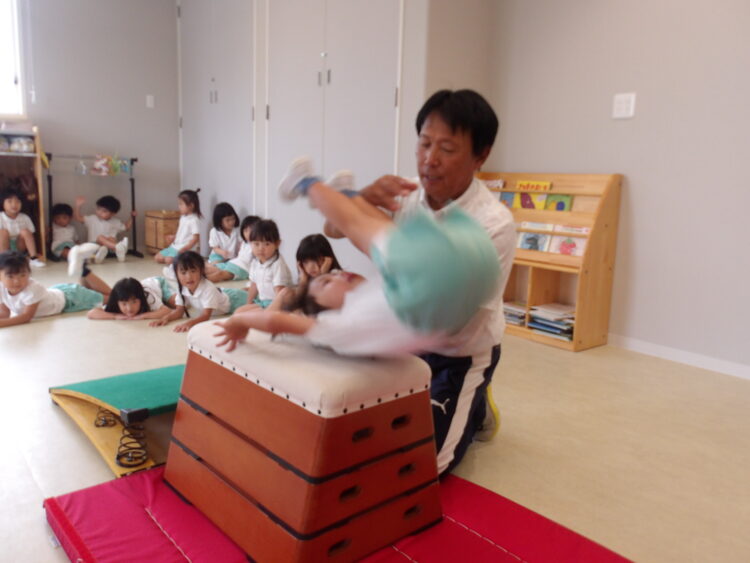 先生に補助をしてもらいながら、マットの上でクルンと後ろ回りをしたり、  鉄棒にも挑戦したりしました!  そして、にじ組さんは跳び箱の上での前転に挑戦しました👏🏻