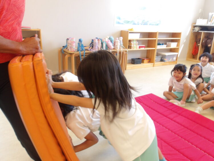 先生のマットの壁を、友だちと力を合わせて押し進めたり…