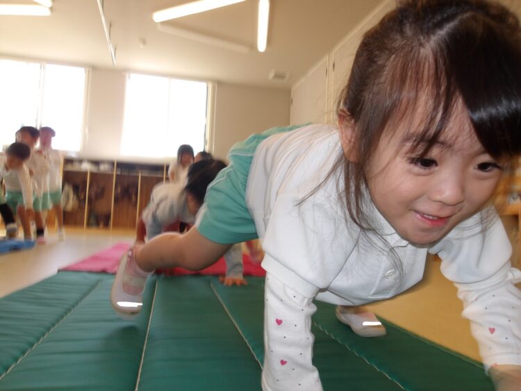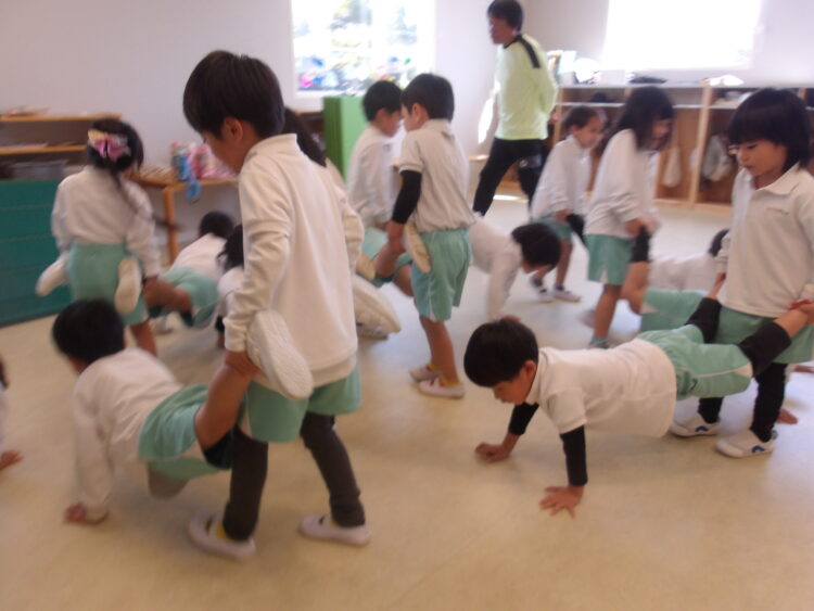 バランスをとりながら片手、両足を床につけてポーズを決めたり、2人1組になってワニさん歩きに挑戦したりしました✨