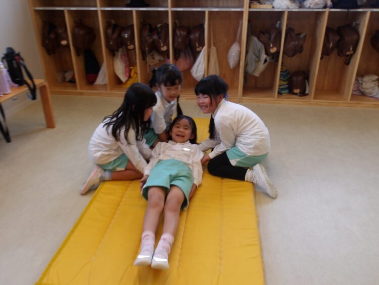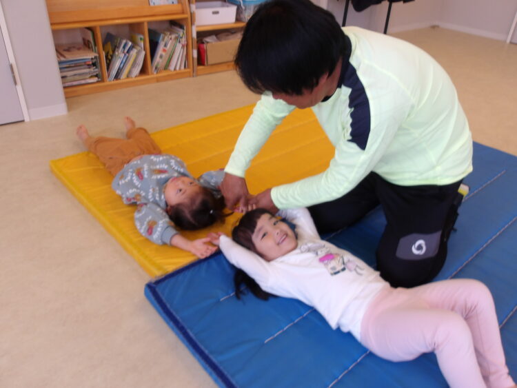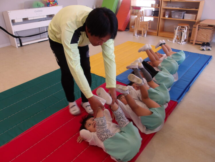 寝ているお友だちをみんなで力を合わせて起き上がらせました!