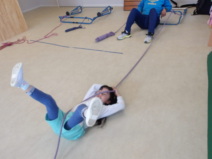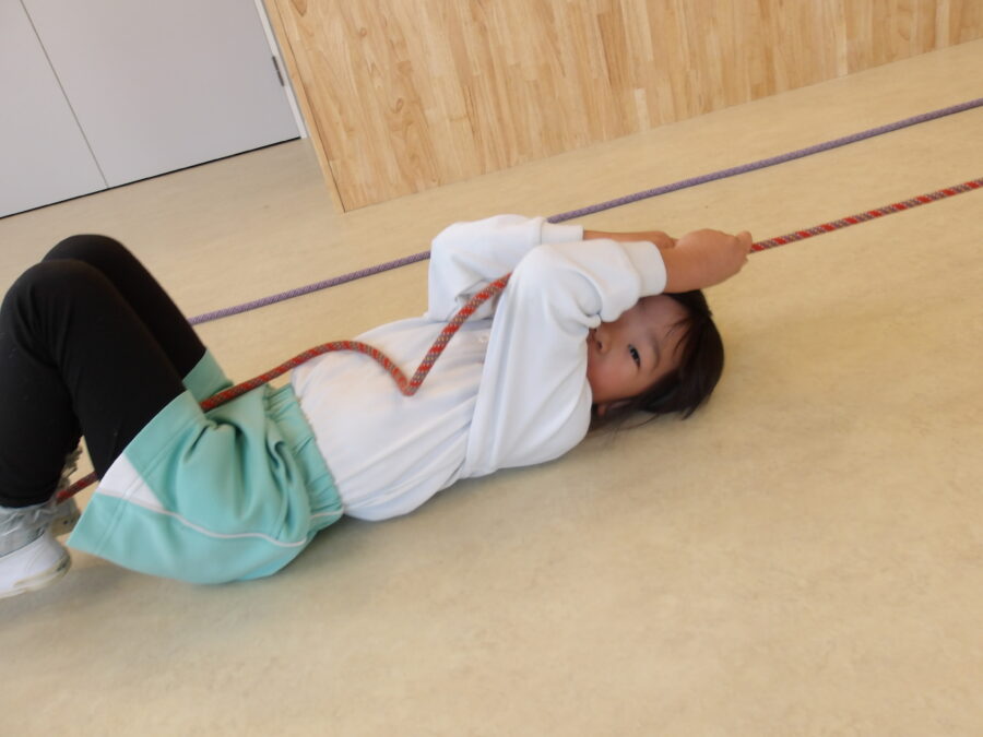 難しくても諦めずに挑戦したり、先生の補助ありで頑張る姿がみられました 次は縄を掴んでのぼり先生の方まで「レスキュー」に挑戦しました!