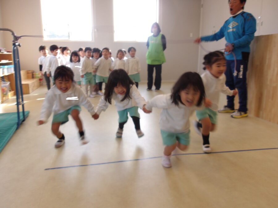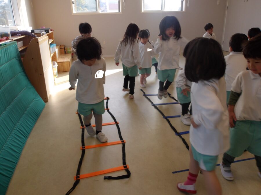 そら組さんは、はしごでジャンプに挑戦!線をよく見てジャンプしていました
